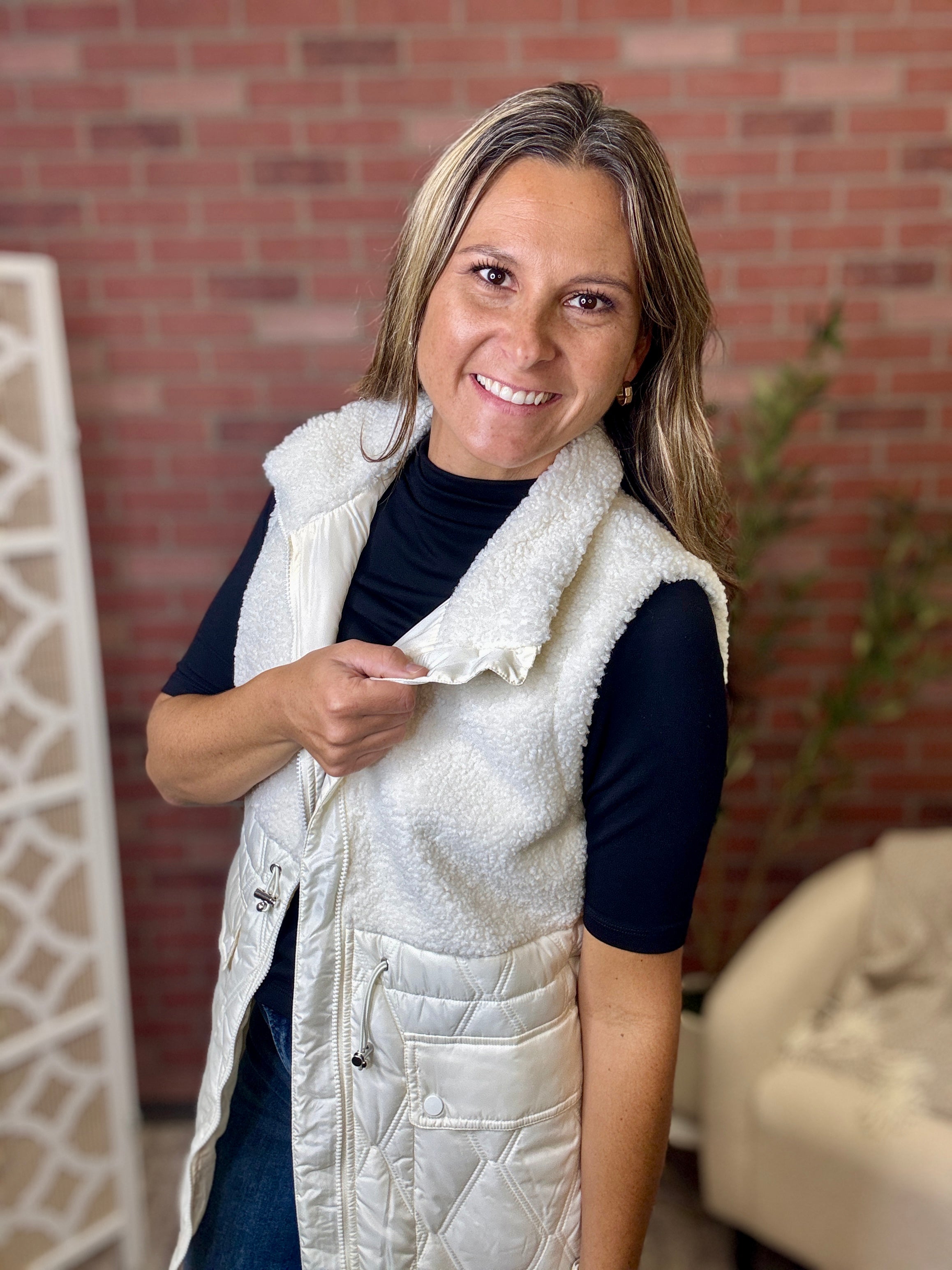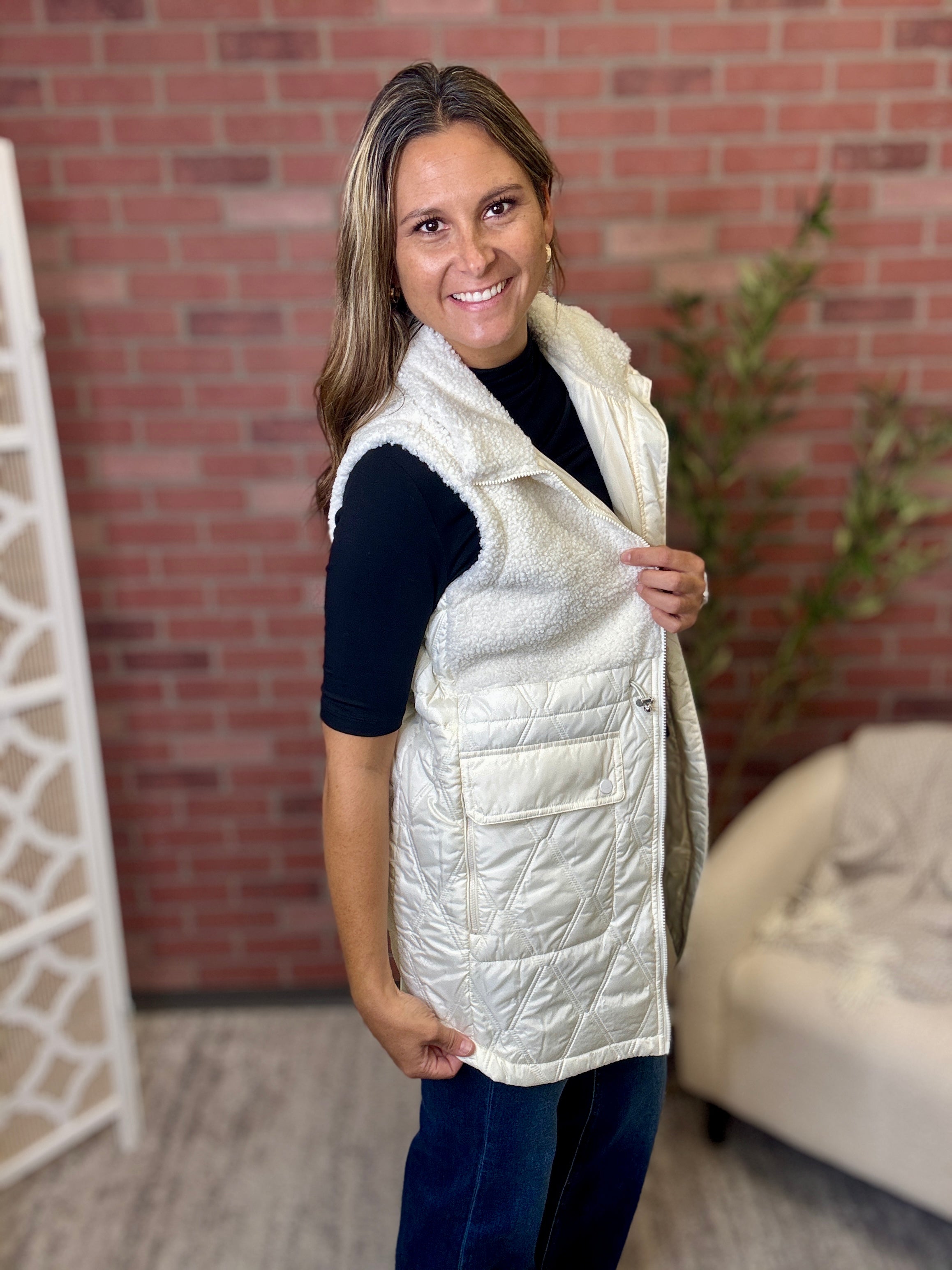 Elevate your outerwear game with the Mixed Media Sherpa Vest—a bold blend of textures designed to turn heads. The plush sherpa front promises warmth and softness, while contrasting fabric panels add an unexpected edge. Perfect for layering over your favorite statement pieces, this vest combines comfort and style for those who dare to stand out in any season.