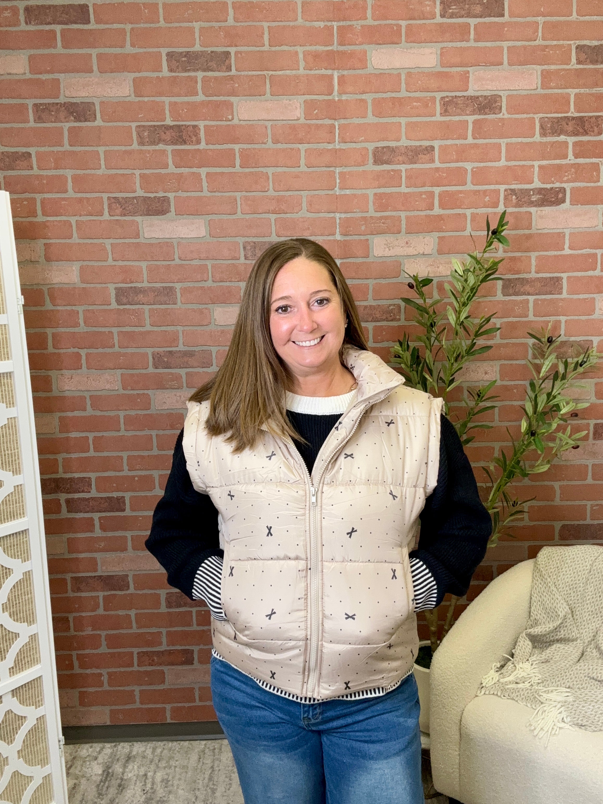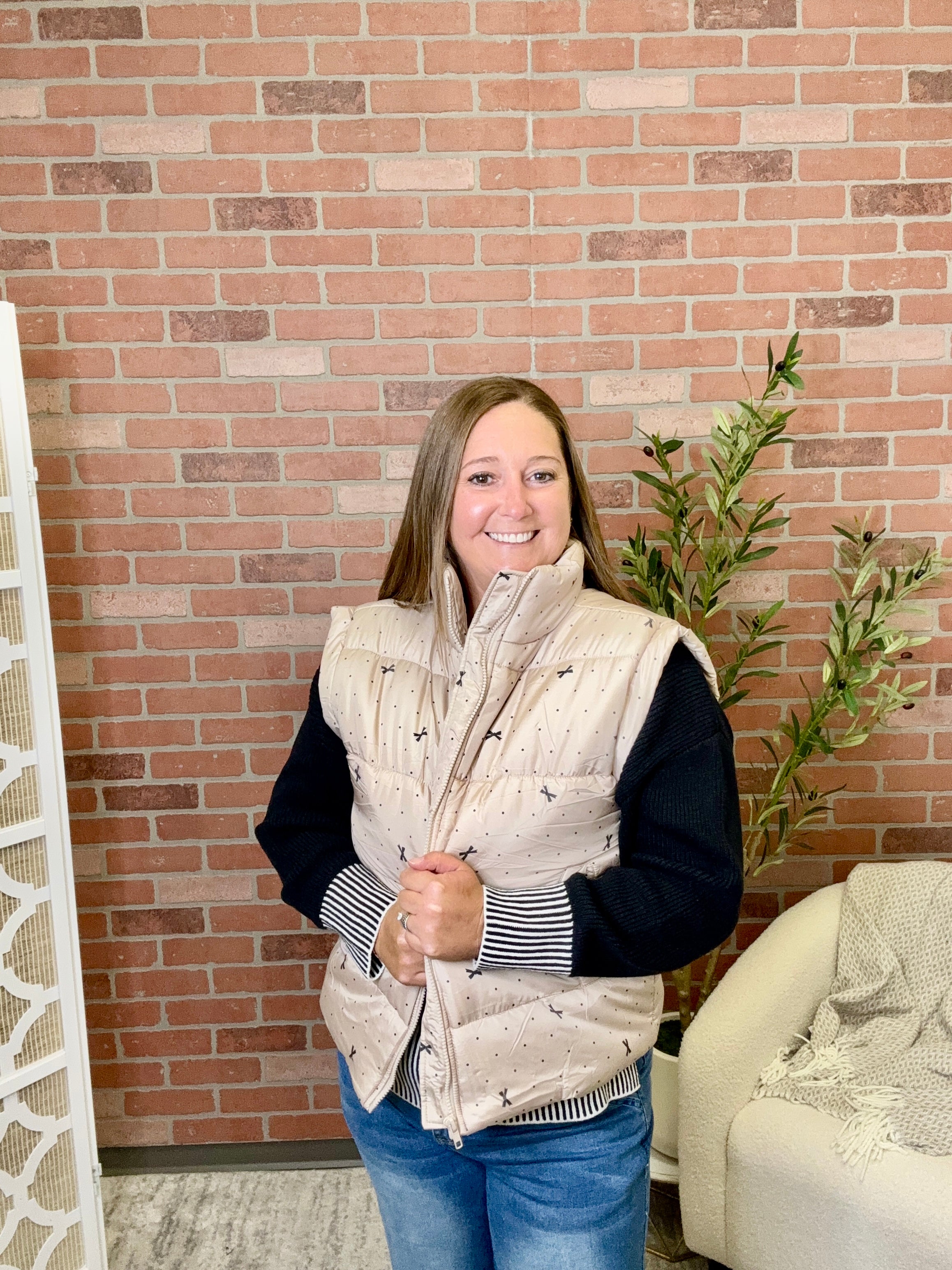 Turn heads in this Polka Dot Bow Puffer vest, designed to fuse bold style with cozy warmth. Featuring eye-catching polka dots and a standout bow detail, it adds playful flair to any outfit. Practical pockets keep essentials close while the puffer design shields you from the chill. Dare to be different with this unique layering piece that combines function and fierce fashion.