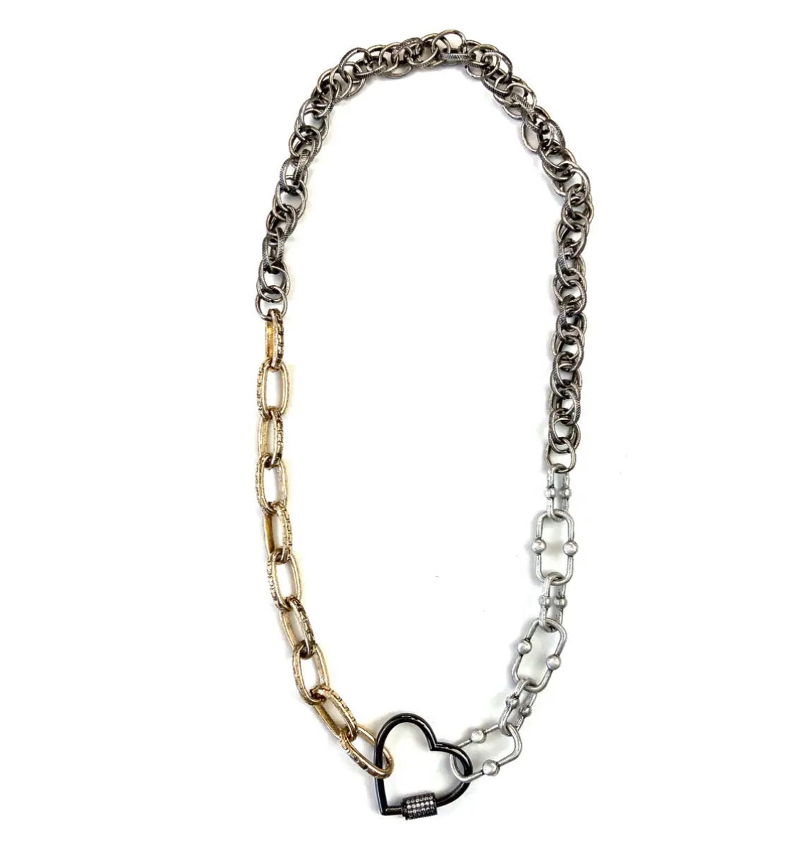 Make a bold statement with this Mixed Chunky Chain Heart necklace! Featuring a playful mix of chunky chain links leading to an eye-catching heart pendant, this piece brings instant personality to any outfit. Perfect for layering or wearing solo, it's the kind of accessory that says you're fun, confident, and totally in charge of your style. Whether you're dressing up or keeping it casual, this necklace adds that perfect touch of charm and attitude.