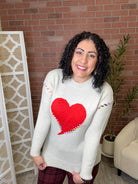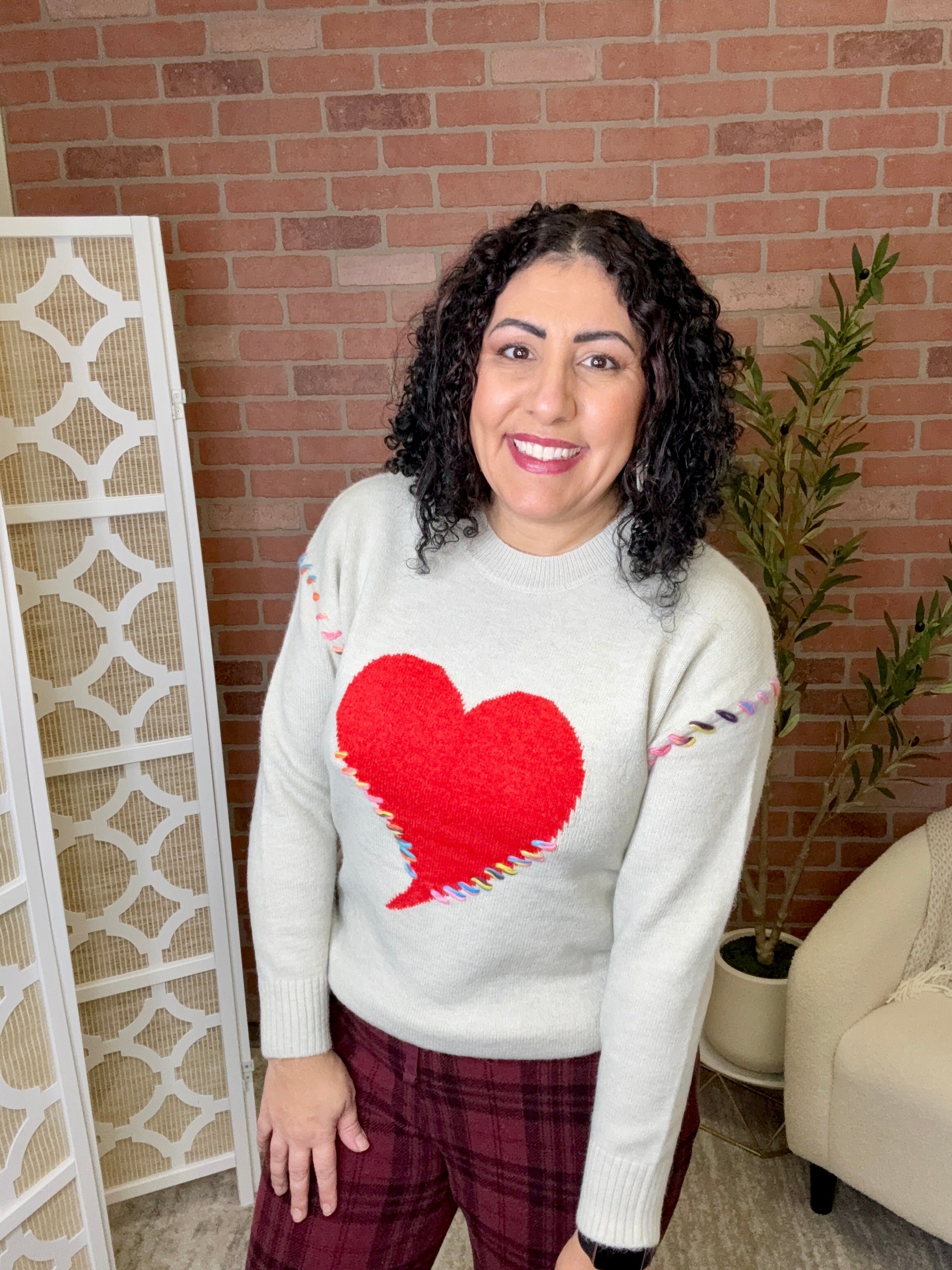 Wrap yourself in cozy charm with this adorable Big Heart Whip Stitch Sweater. Featuring a bold heart design crafted with distinctive whip stitching, this piece brings playful personality to your everyday wardrobe. The soft, comfortable knit makes it perfect for casual outings or relaxed days at home. Layer it over your favorite tee or wear it solo for an instant mood boost. A sweet statement piece that celebrates love and style in one delightful package.