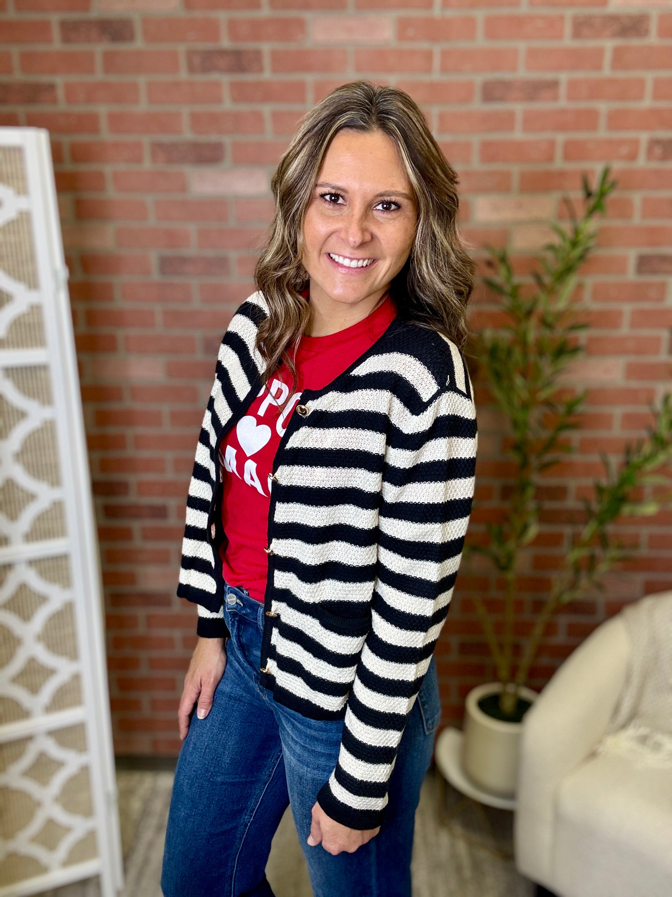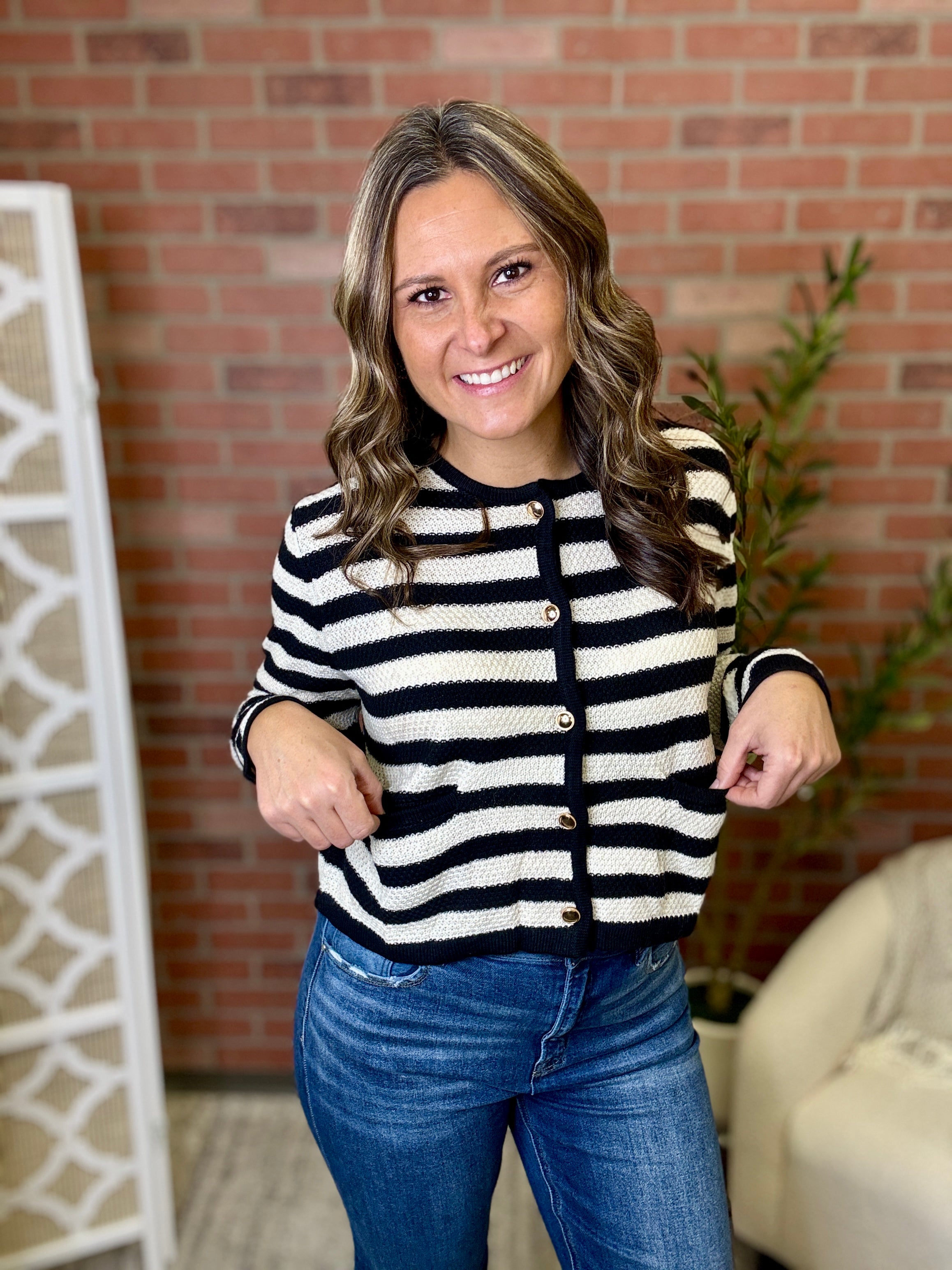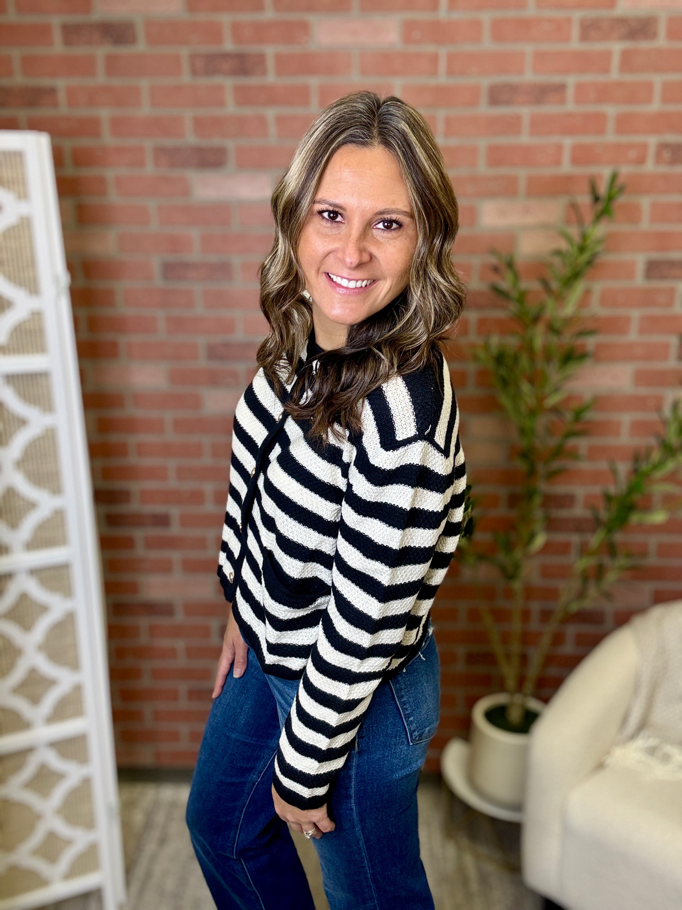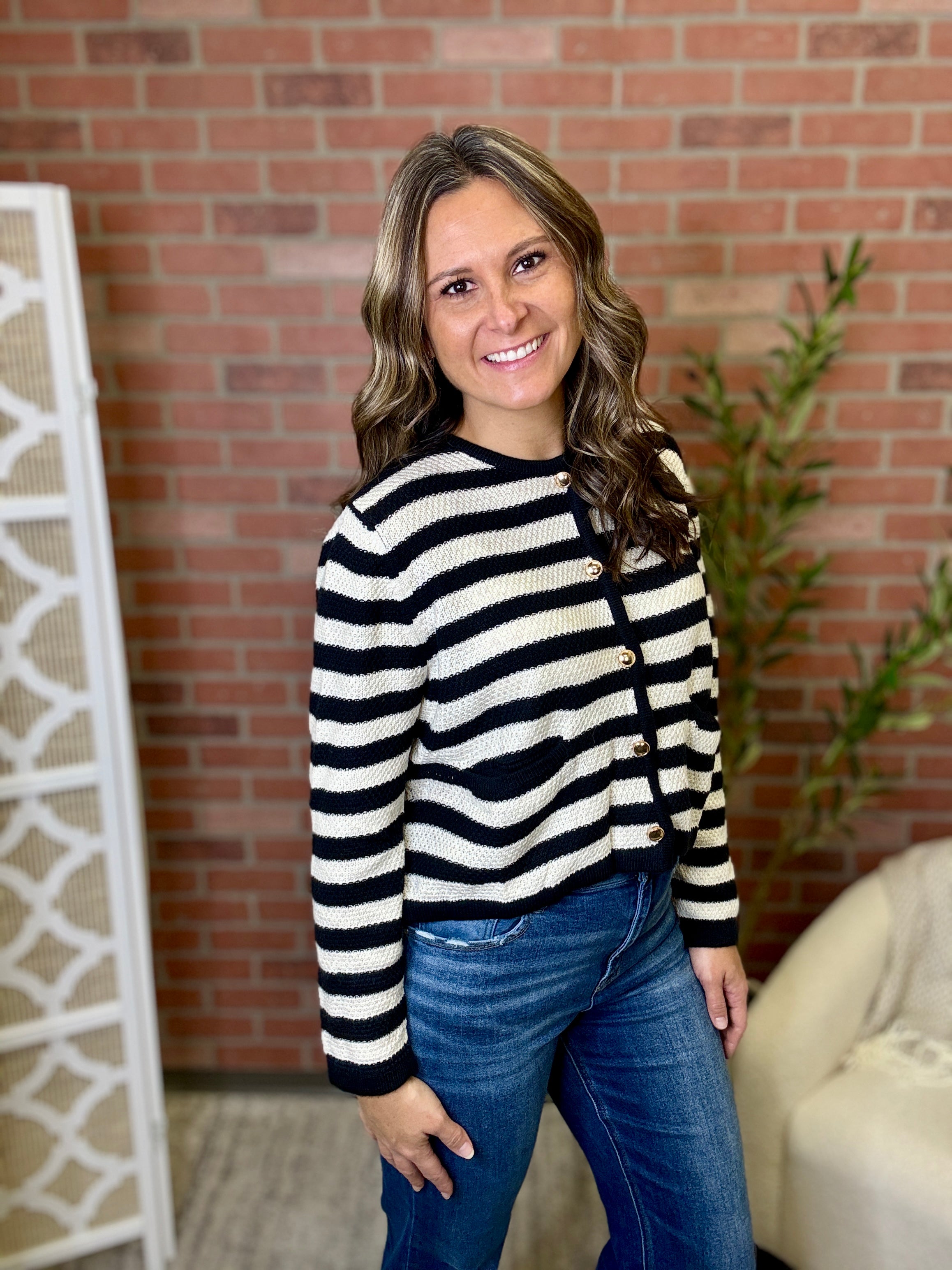 Stripes never go out of style, and this cardi proves it! Featuring a charming gold button closure and classic striped pattern, it's the perfect layer for effortless sophistication. Slip it on over your favorite tee or dress it up with a blouse—this versatile piece transitions seamlessly from casual coffee runs to weekend adventures. Cozy, chic, and endlessly wearable.