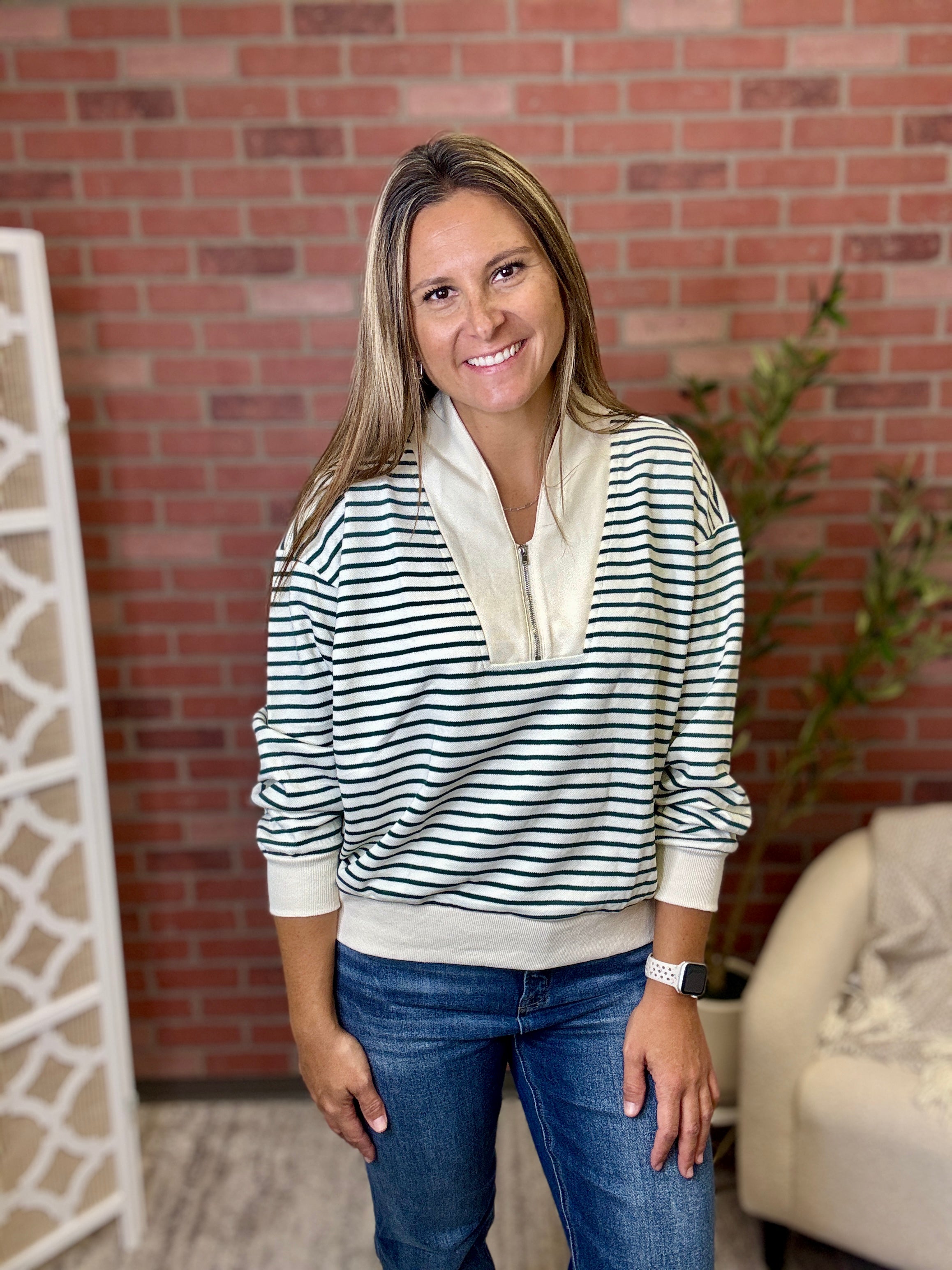 Stay cozy and stylish with this Half Zip Stripe Sweater! Its playful stripes and easy half-zip design make layering a breeze, perfect for adding a pop of fun to any outfit. Whether you're out for a casual stroll or lounging at home, this sweater keeps comfort and charm close at hand.