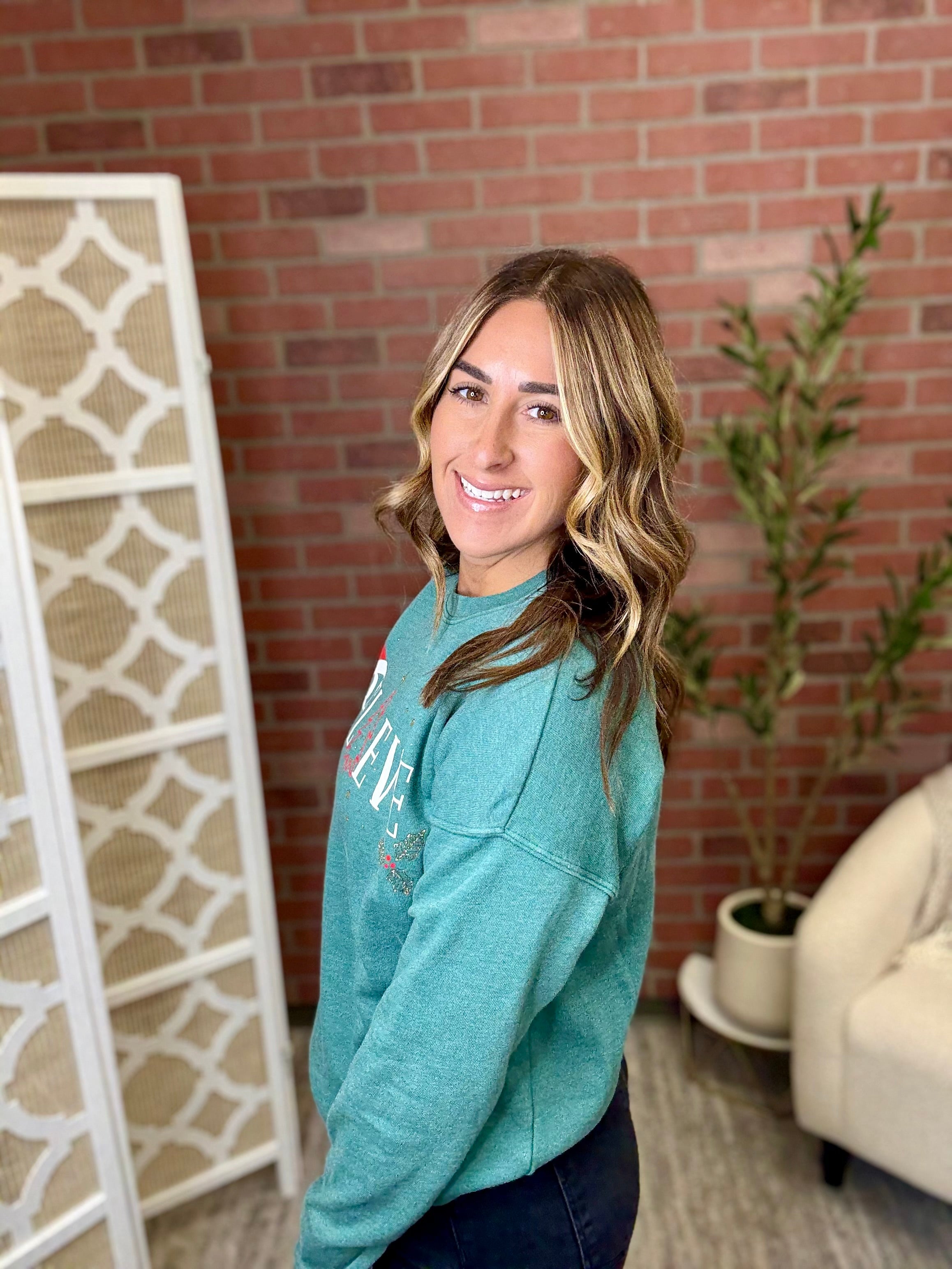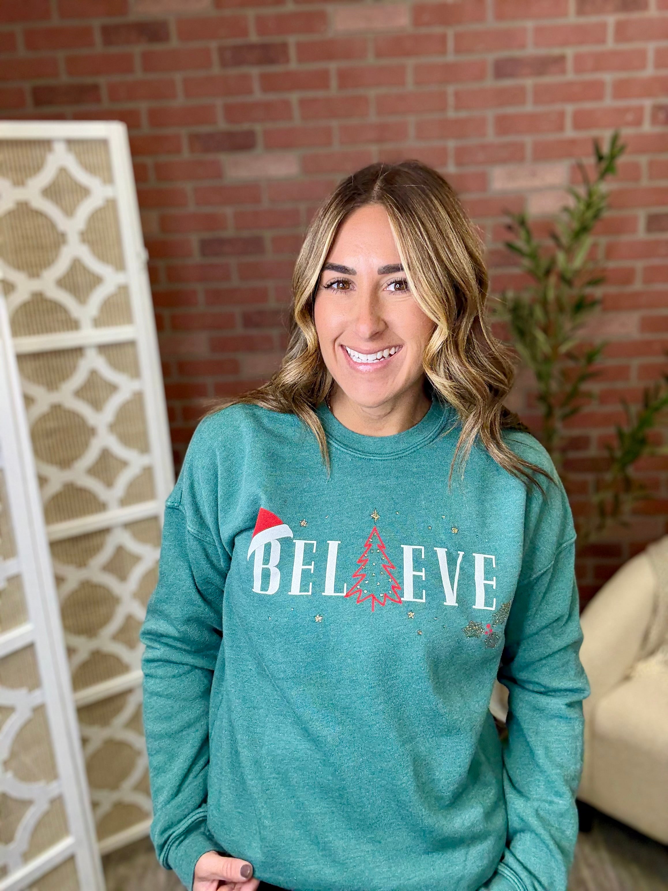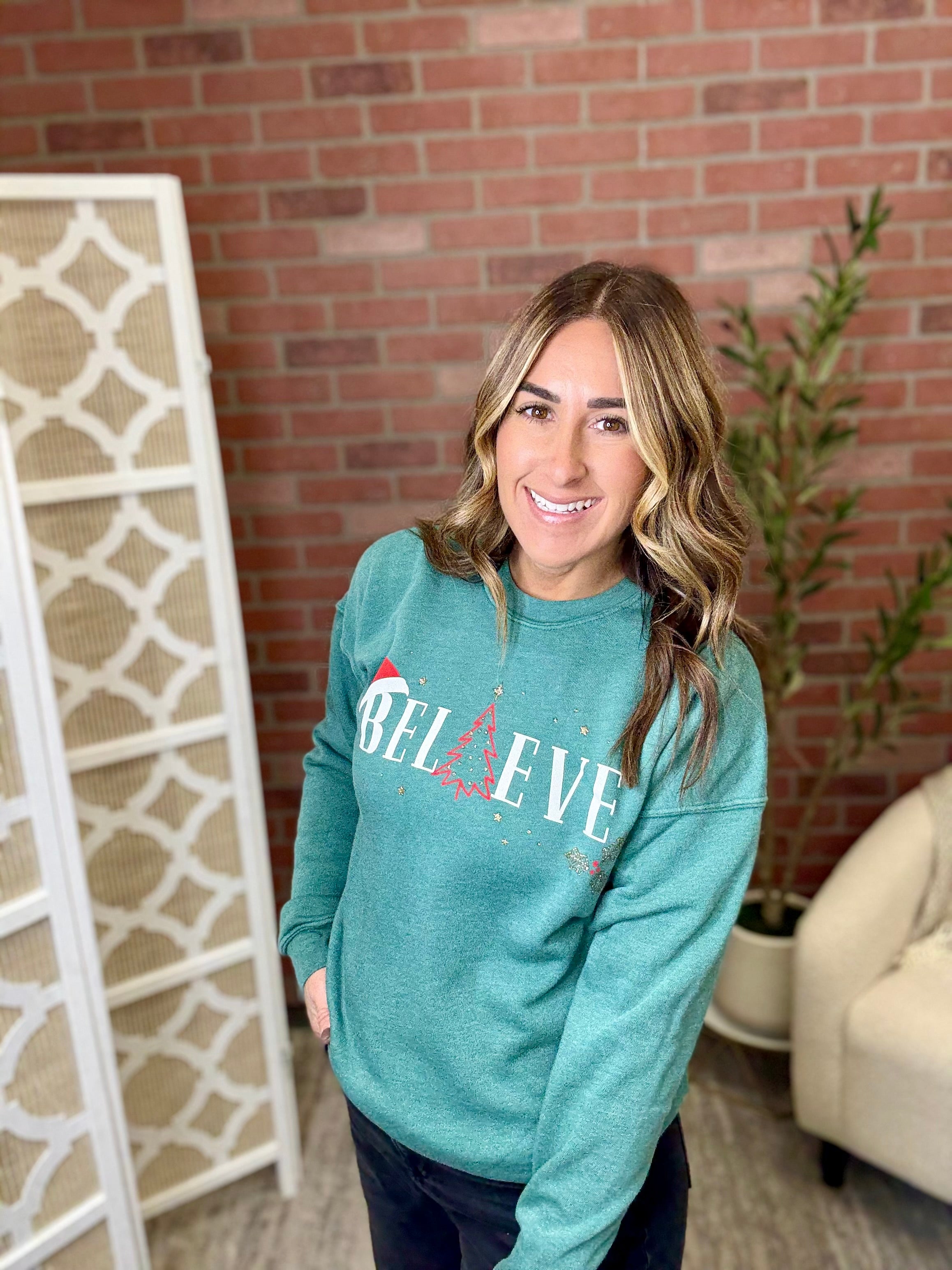 Spread holiday cheer in this shimmering "Believe" sweatshirt! Cozy comfort meets festive sparkle with eye-catching glitter detailing that catches the light. Perfect for holiday parties, family gatherings, or spreading seasonal magic wherever you go. Soft, warm, and wonderfully merry.