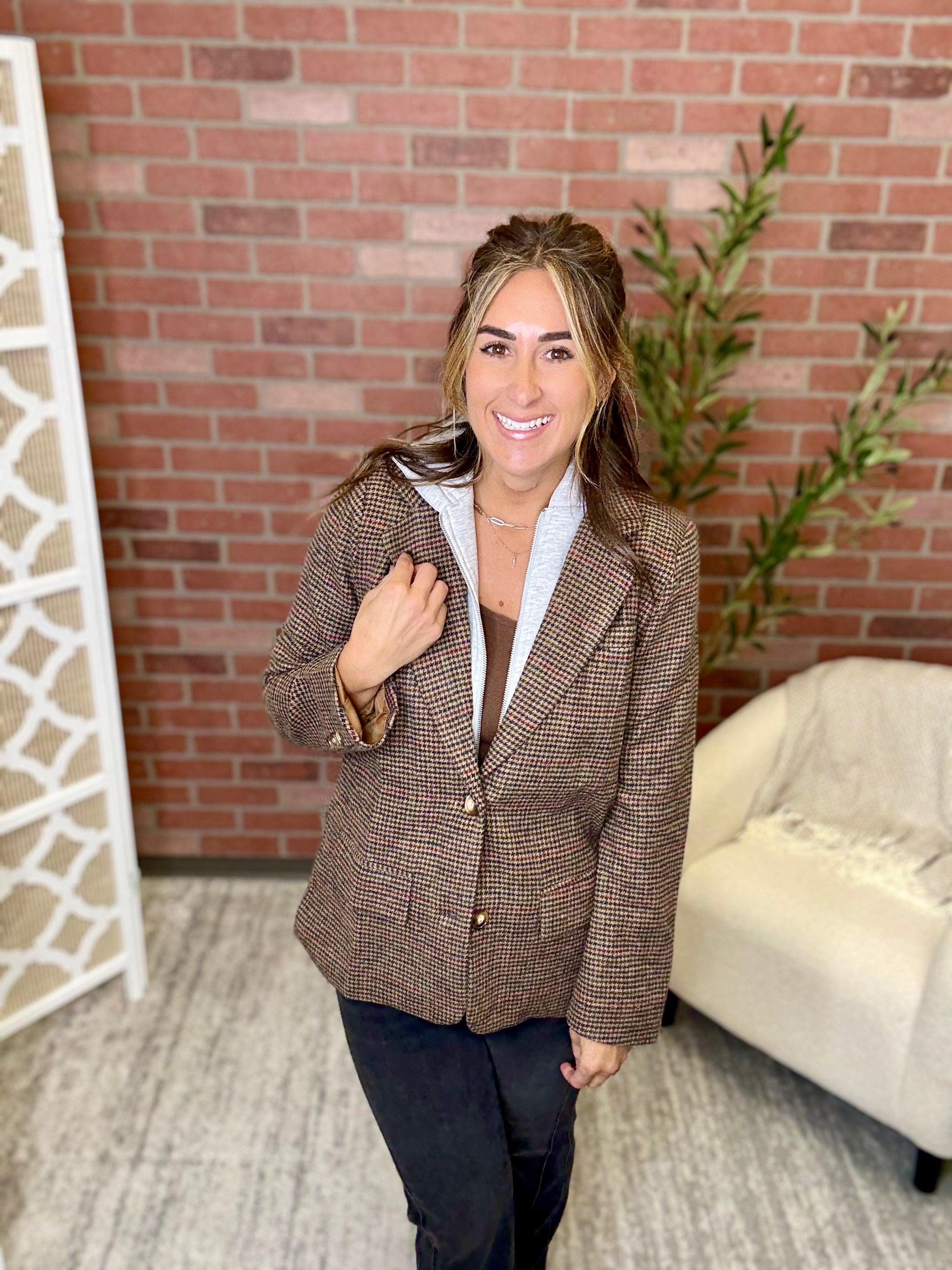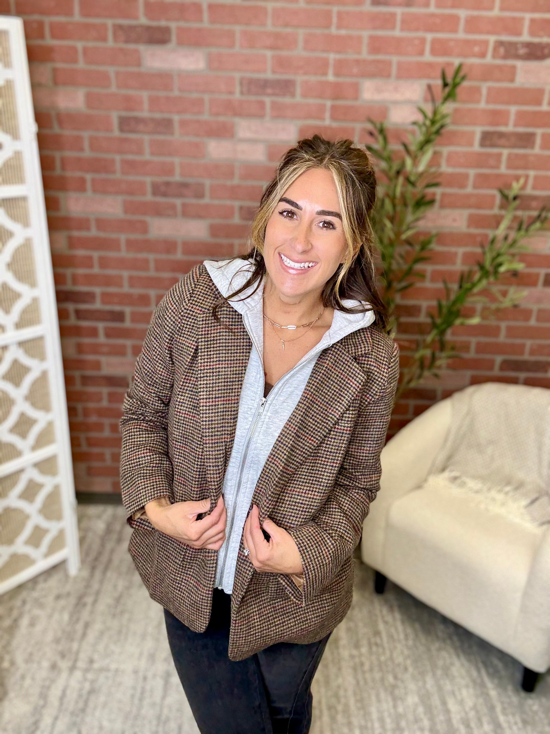 Make a bold statement with the Houndstooth Hoodie Blazer—a fearless blend of sharp tailoring and casual edge that sets you apart.