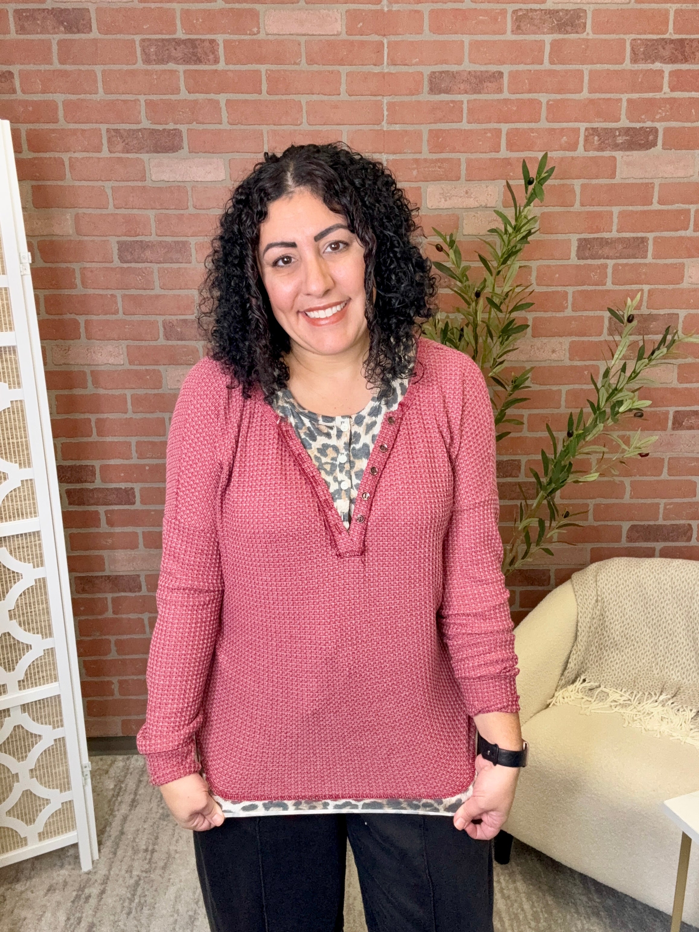 Unleash your wild side with this Leopard Double Henley—a playful twist on a classic favorite. Featuring a bold leopard print that commands attention, the double henley design adds dimension and visual interest to your everyday wardrobe. Perfect for layering or wearing solo, this piece brings attitude and style to casual outfits. Whether you're channeling your inner fashionista or just want to add some spotted sass to your look, this top delivers personality with comfort.