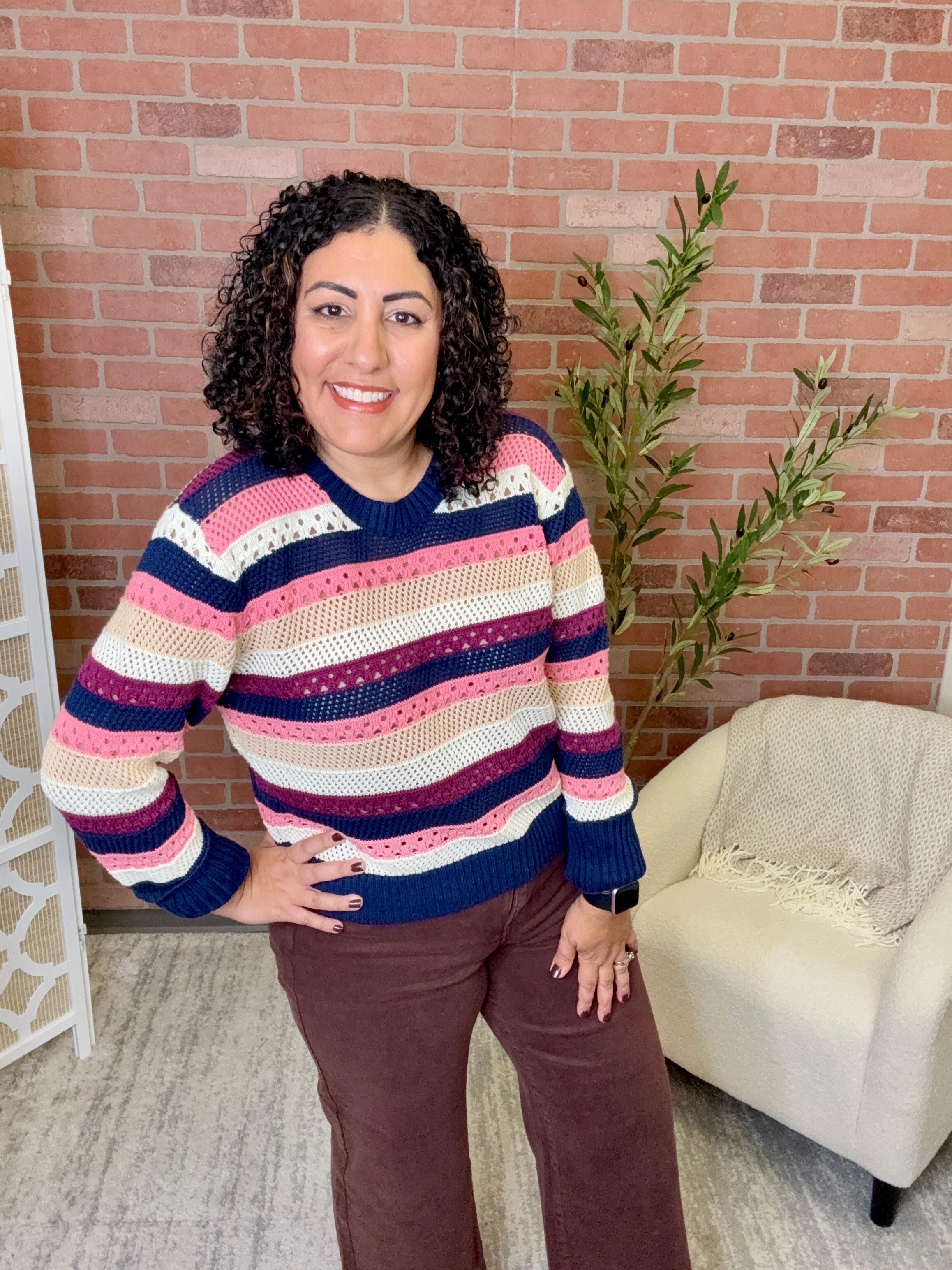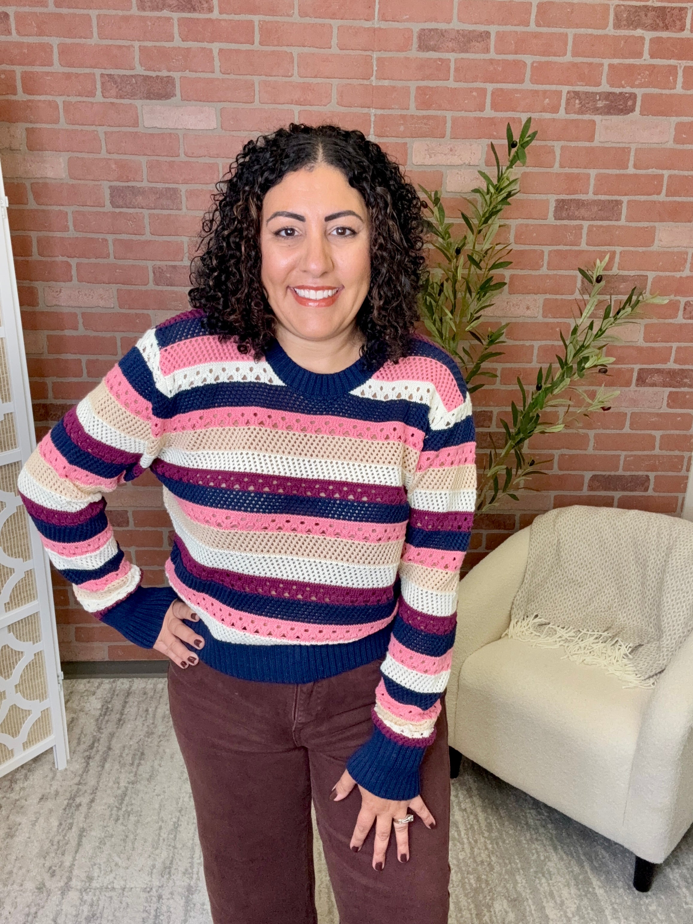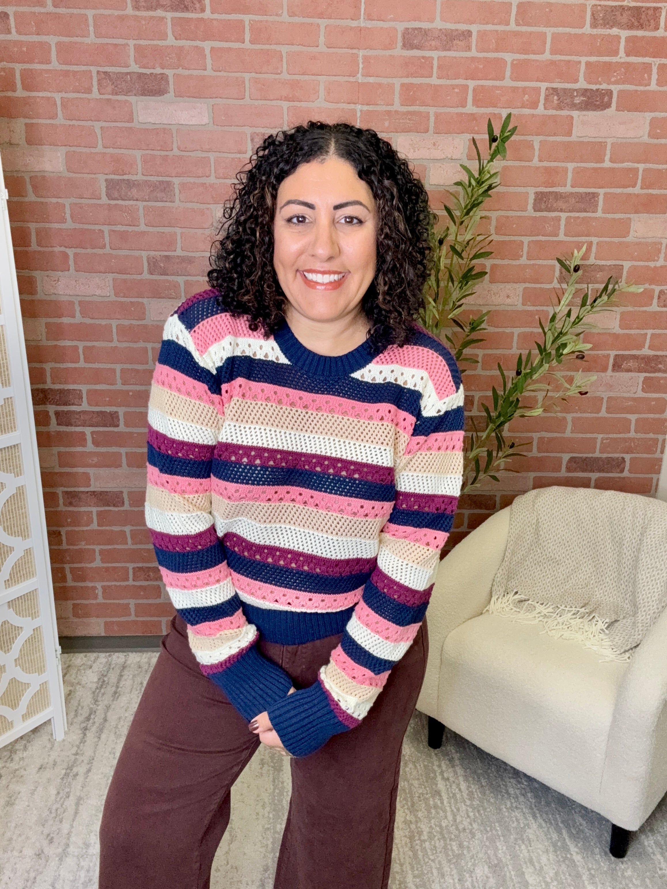 Stay breezy and chic in this Open Crochet Striped Sweater, perfect for layering with your favorite outfits. Its airy crochet design and playful stripes let you show off your style while keeping things light and comfortable. Whether you're heading out for a casual day or a cozy evening, this sweater adds a fun, textured touch to any look.