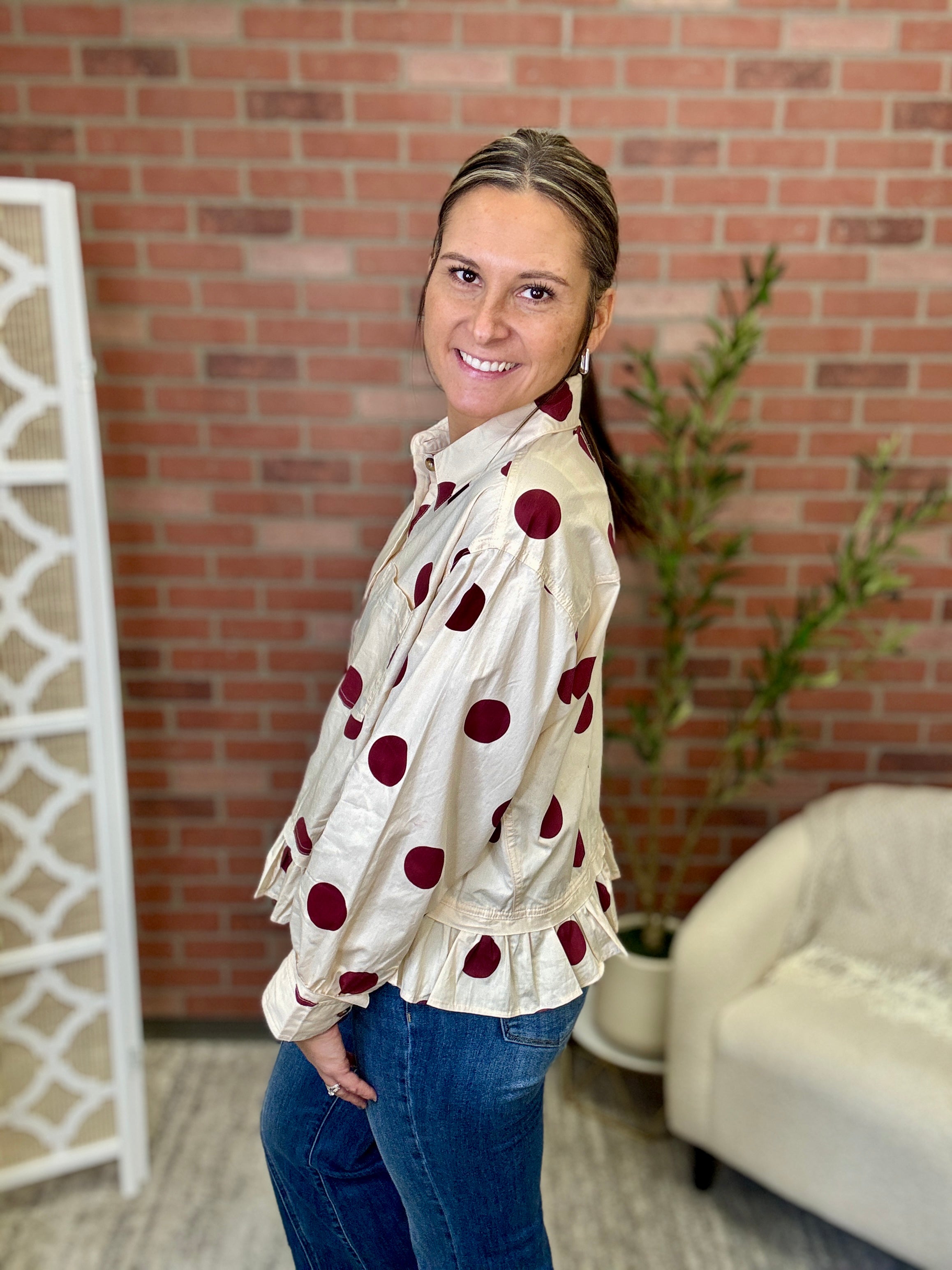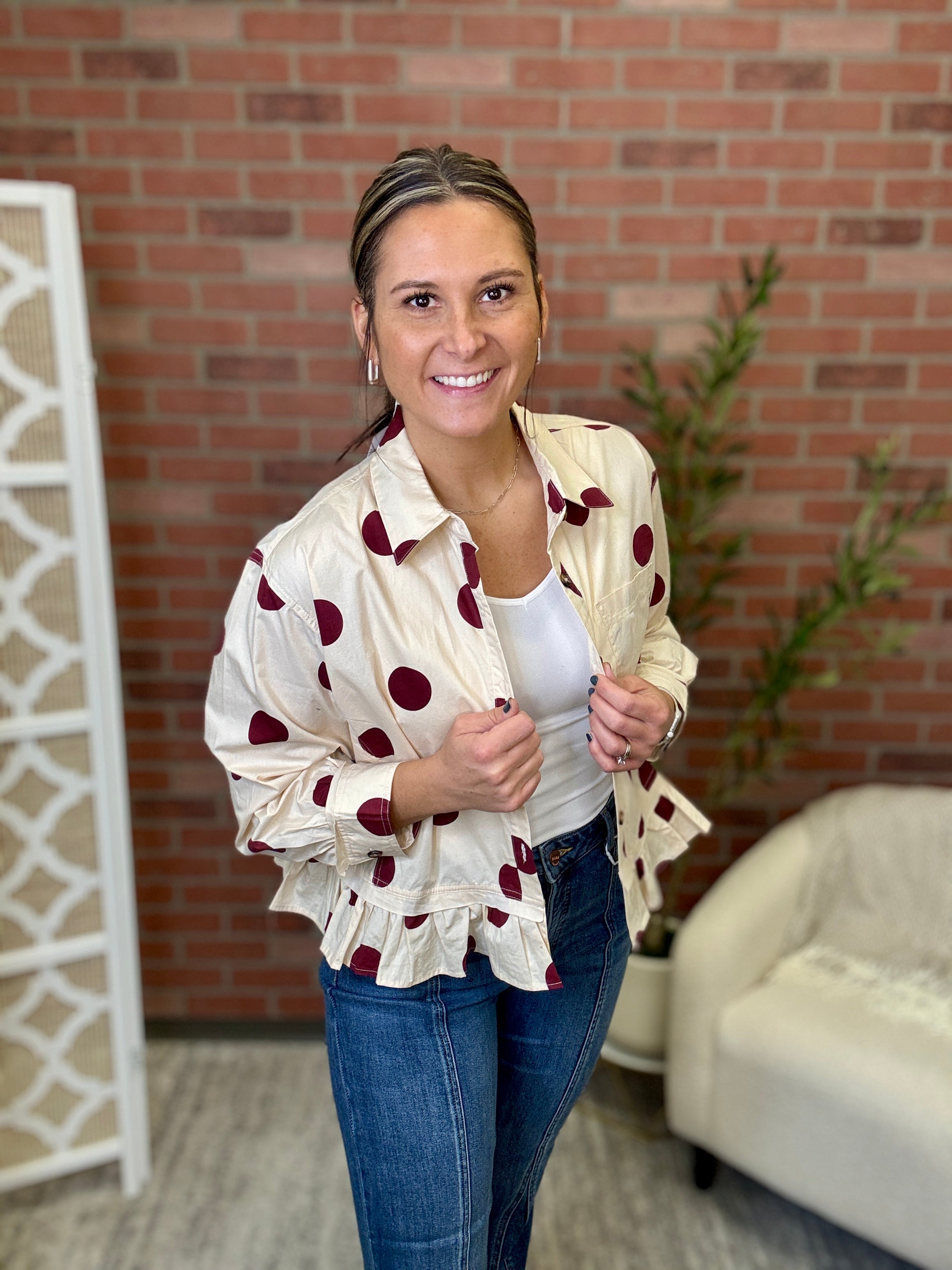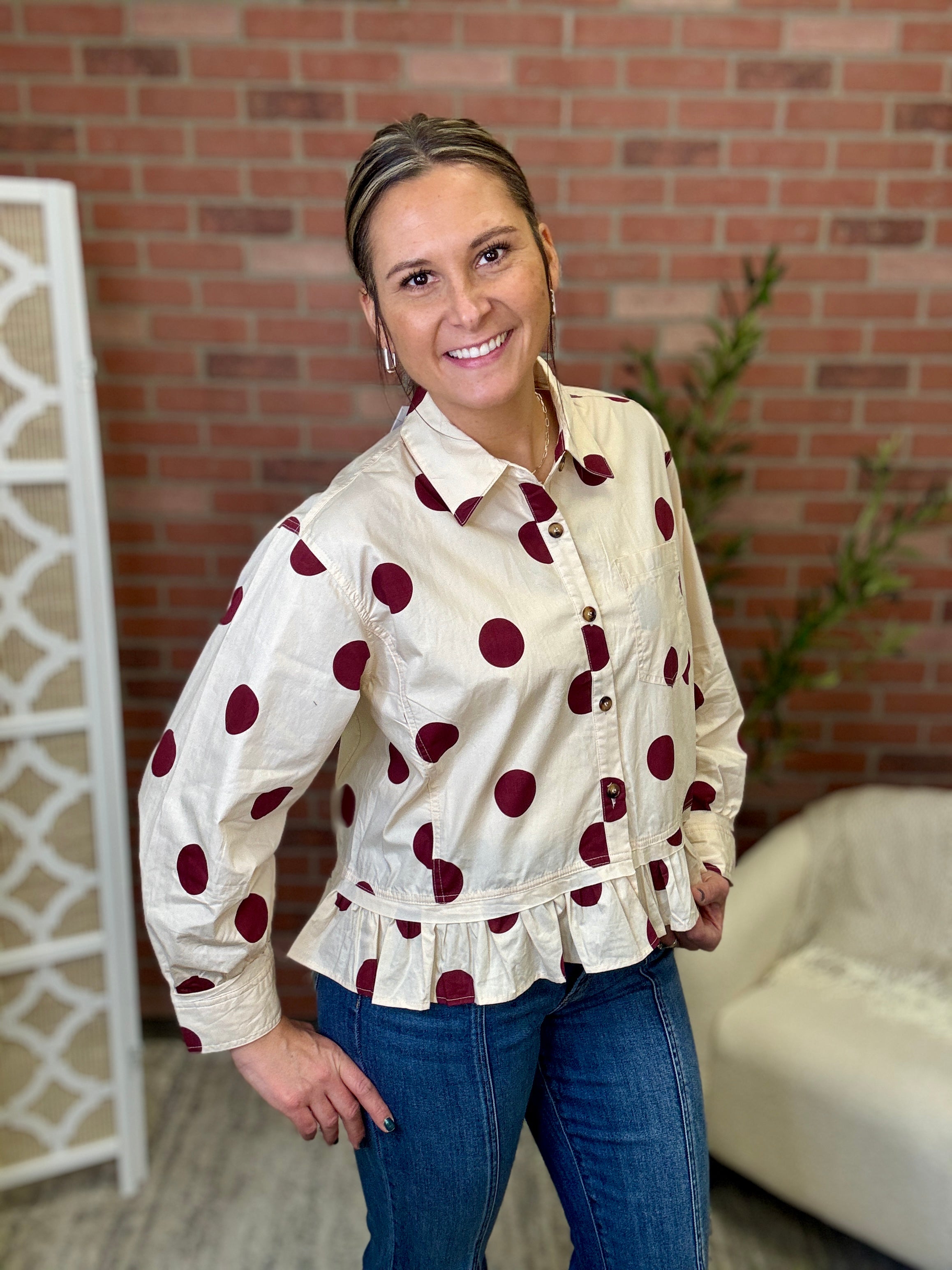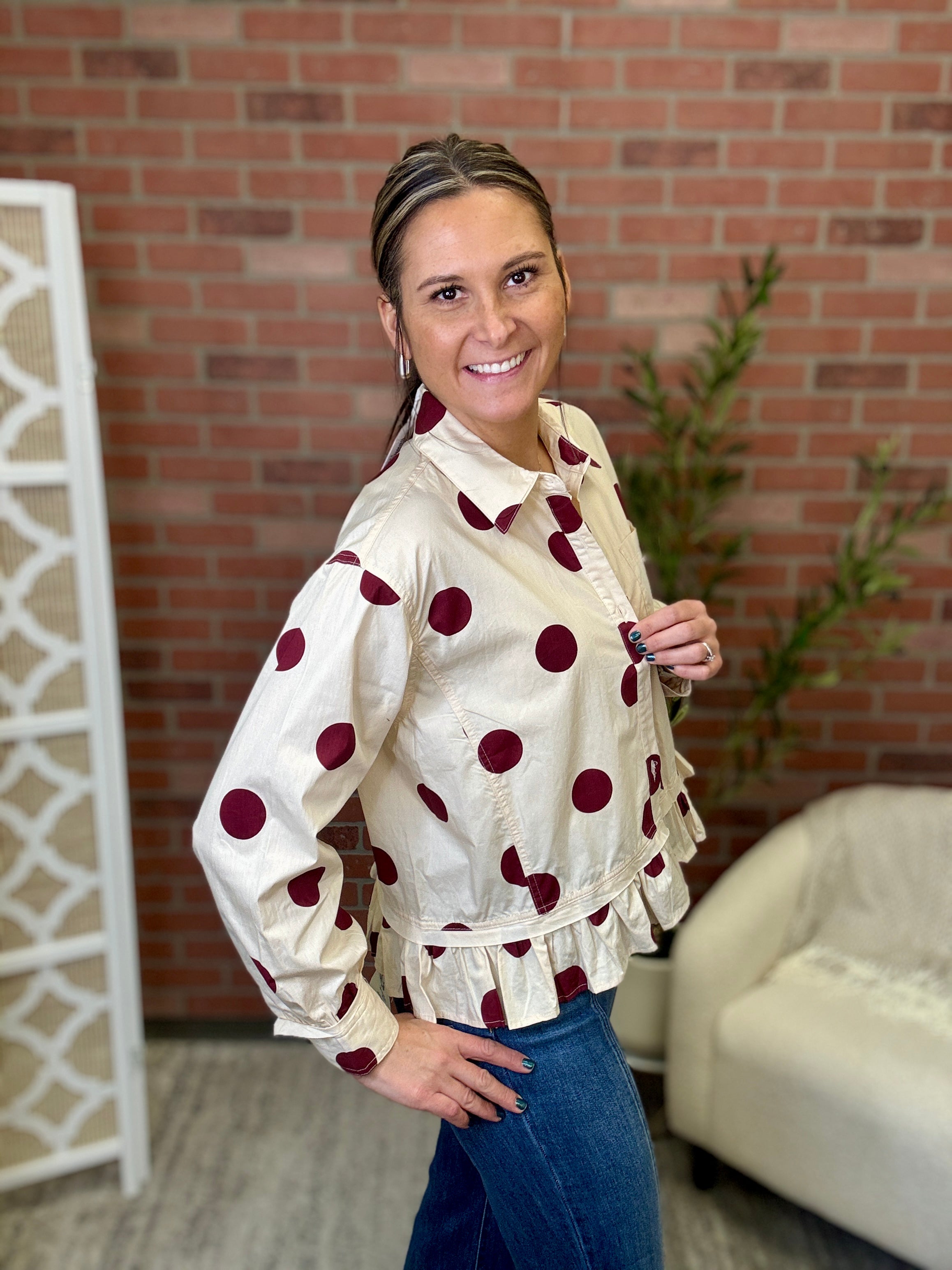 Playful polka dots meet effortless style in this charming button-down shirt. The classic black-and-neutral pattern pairs perfectly with the relaxed fit, making it ideal for casual days when you want to look put-together without trying too hard. A single chest pocket keeps things practical, while the flirty ruffle hem adds just the right amount of movement and personality. Dress it up or down—this versatile piece is ready for whatever your day brings.