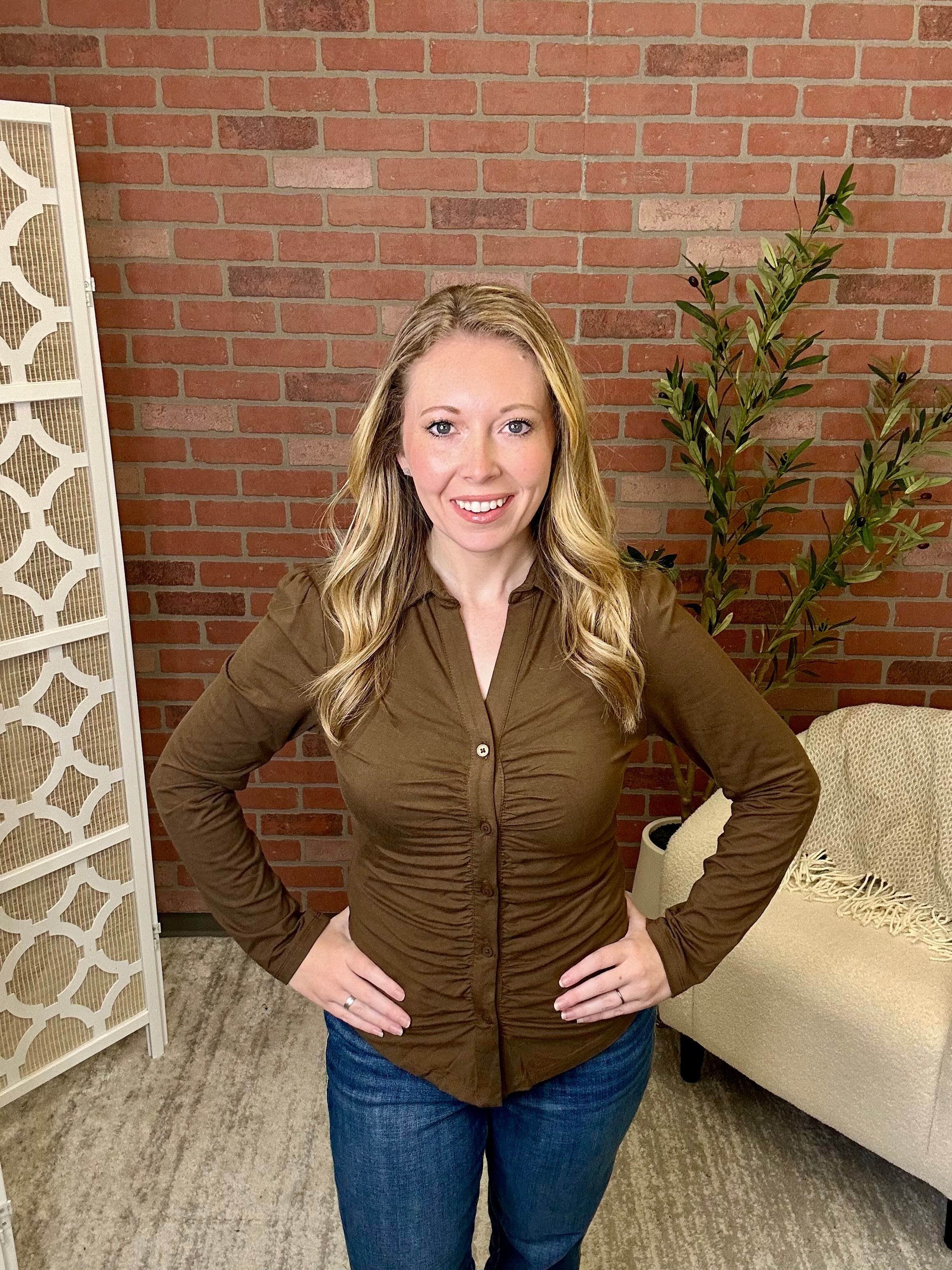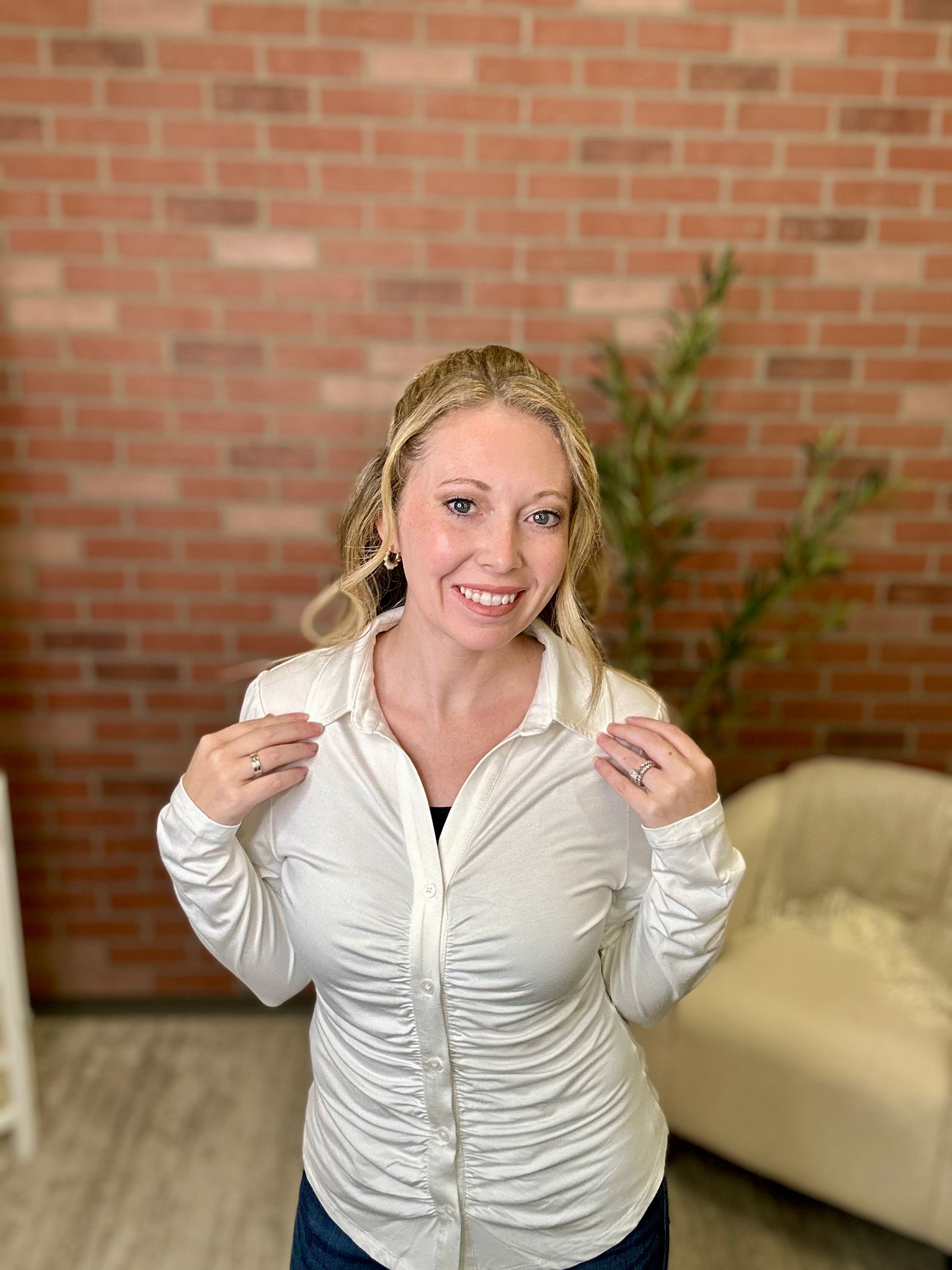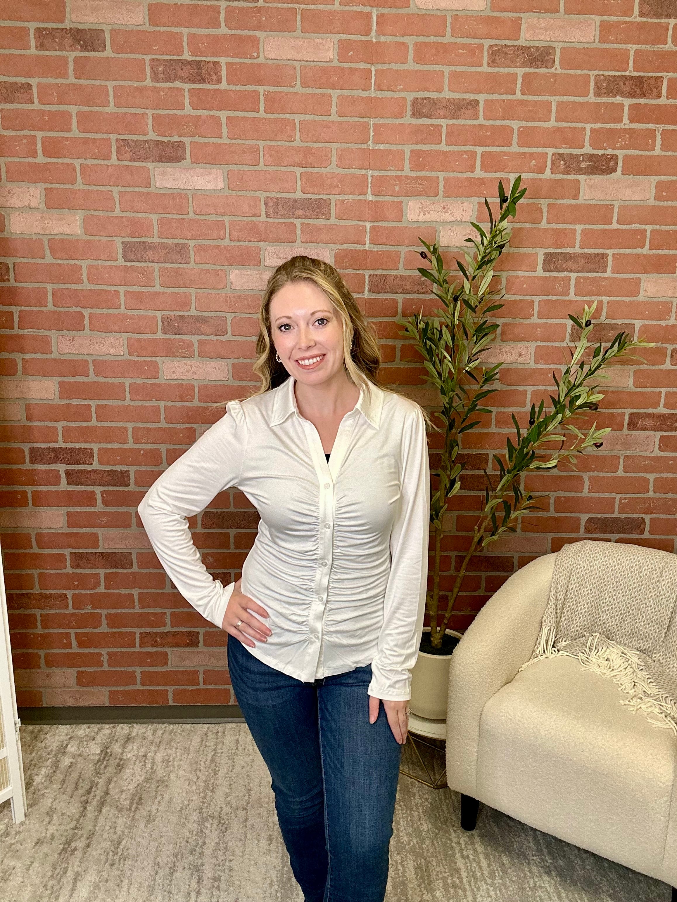 Elevate your look with this daring ruched front long-sleeve button-up. The gathered detail adds bold texture and shape, while the sleek buttons provide a fierce finishing touch. Perfect for making a confident statement wherever you go.