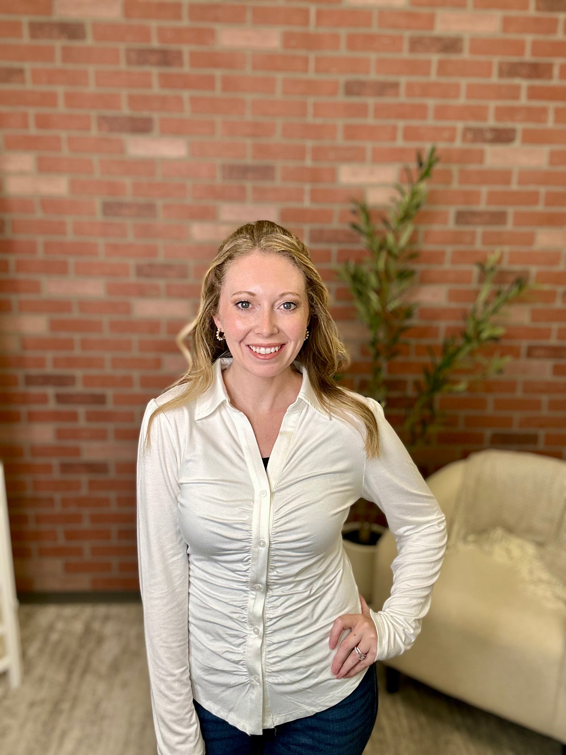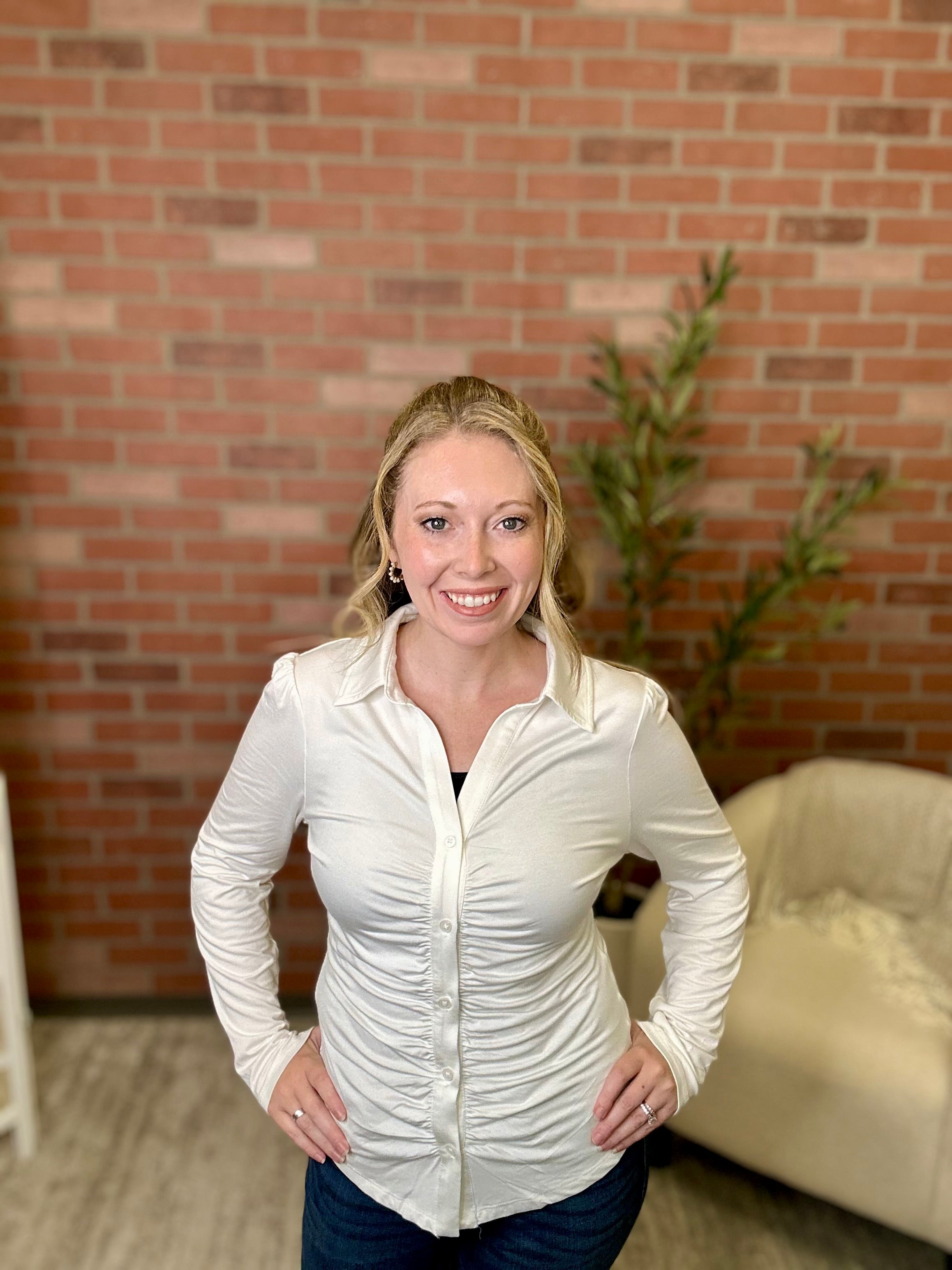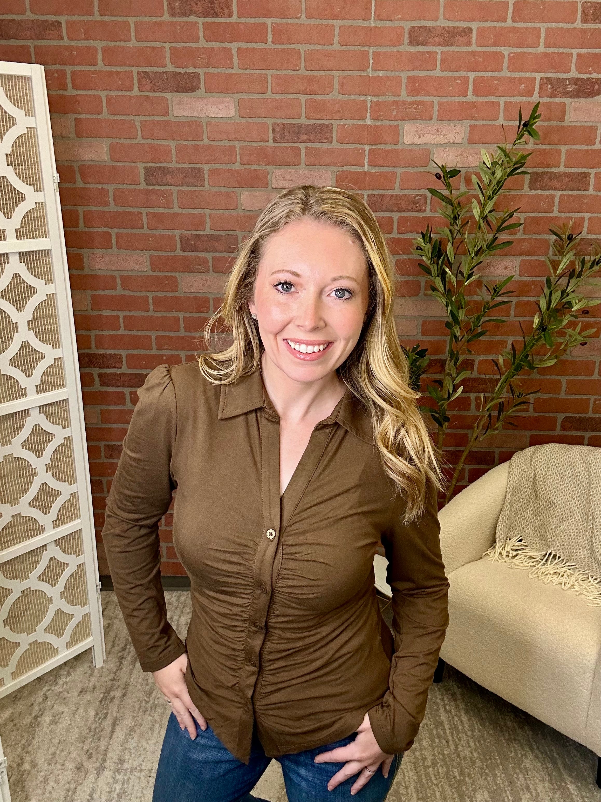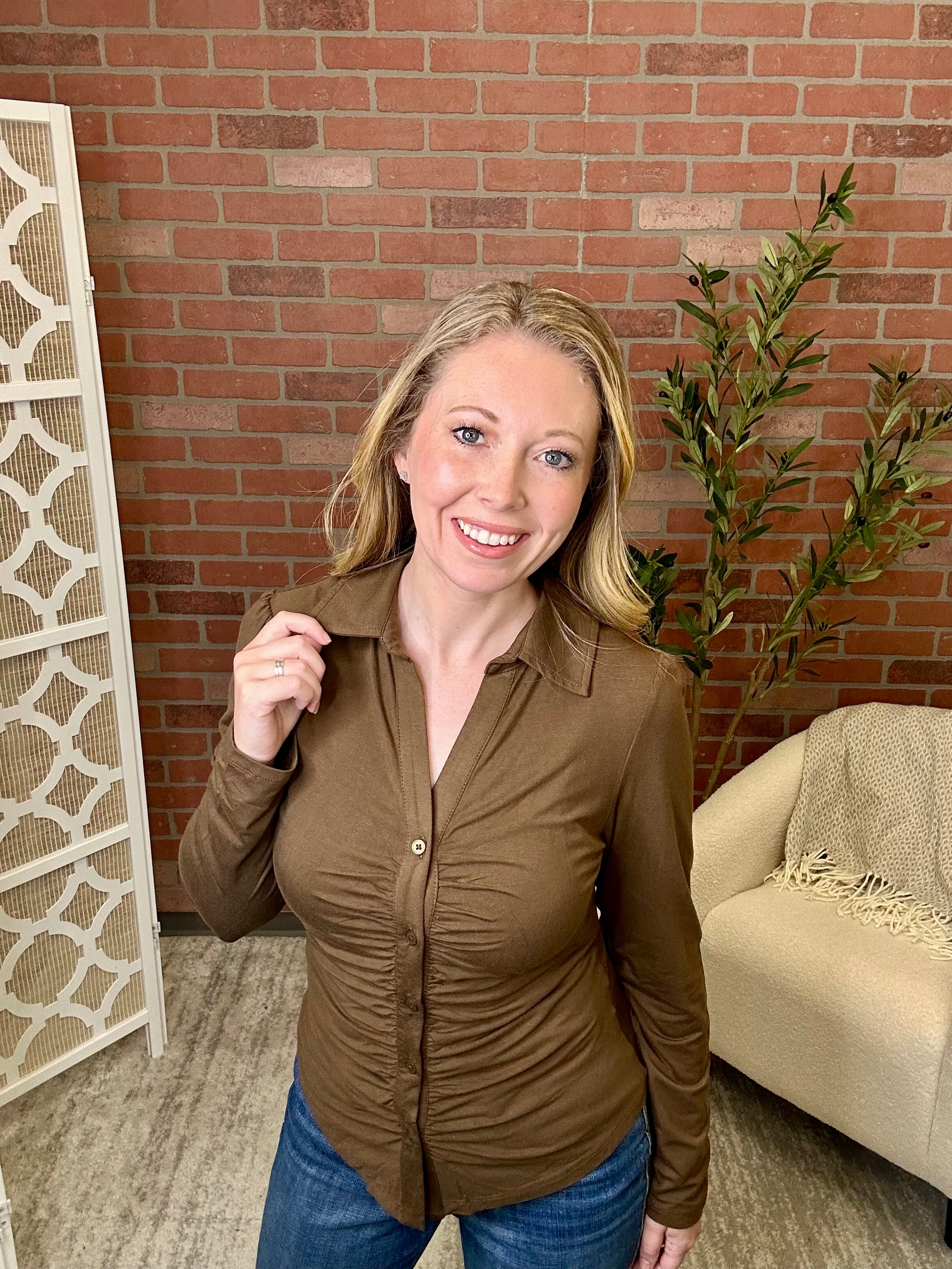 Elevate your look with this daring ruched front long-sleeve button-up. The gathered detail adds bold texture and shape, while the sleek buttons provide a fierce finishing touch. Perfect for making a confident statement wherever you go.