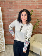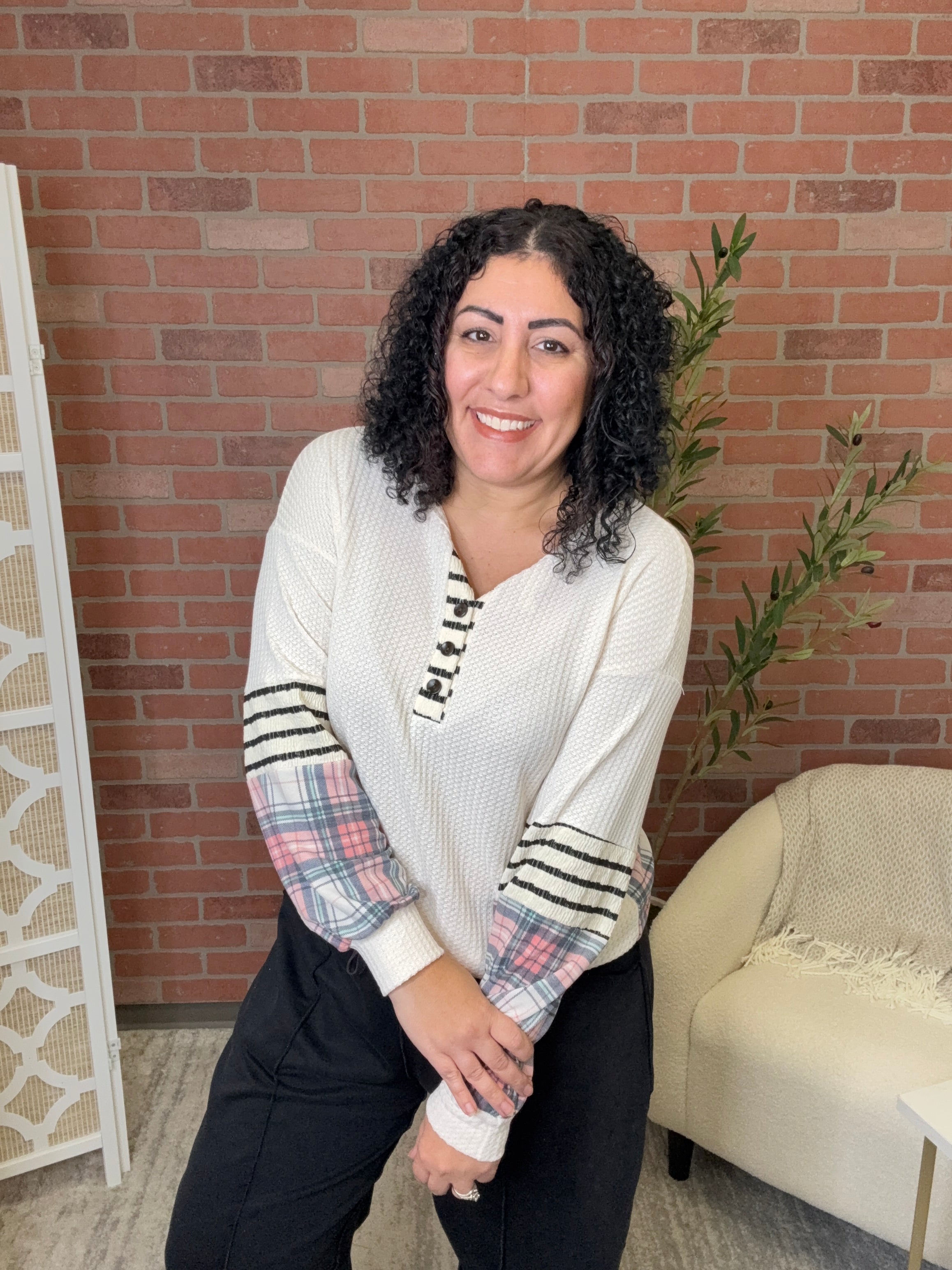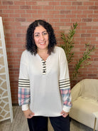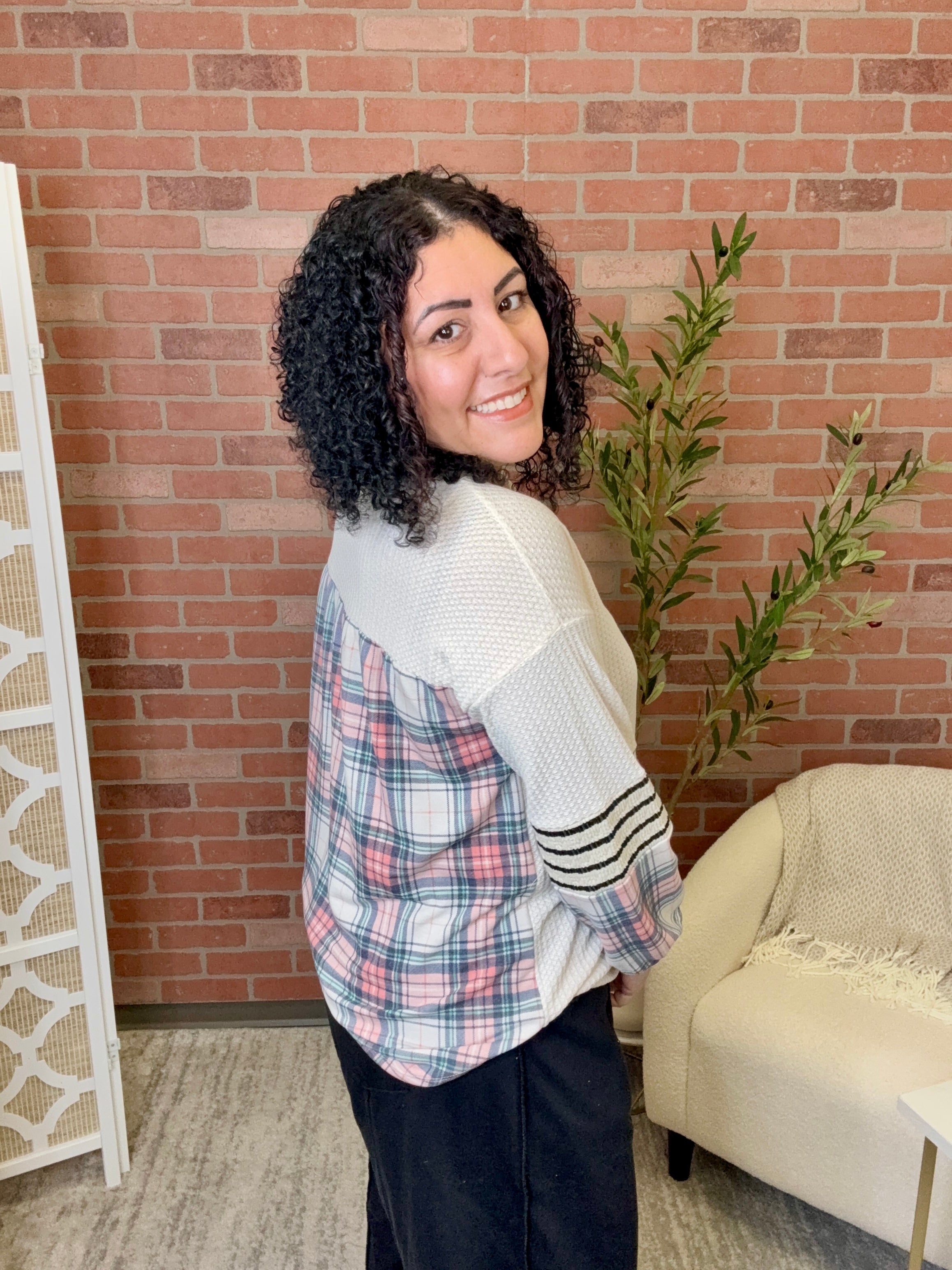 Cozy up in this charming waffle knit featuring a delightful plaid stripe pattern. The textured waffle weave adds visual interest and dimension, while the classic plaid design brings timeless style to your everyday wardrobe. Perfect for layering or wearing solo, this piece strikes the ideal balance between comfort and sophistication. Whether you're running errands or settling in for a relaxed weekend, this versatile knit keeps you looking effortlessly put-together.