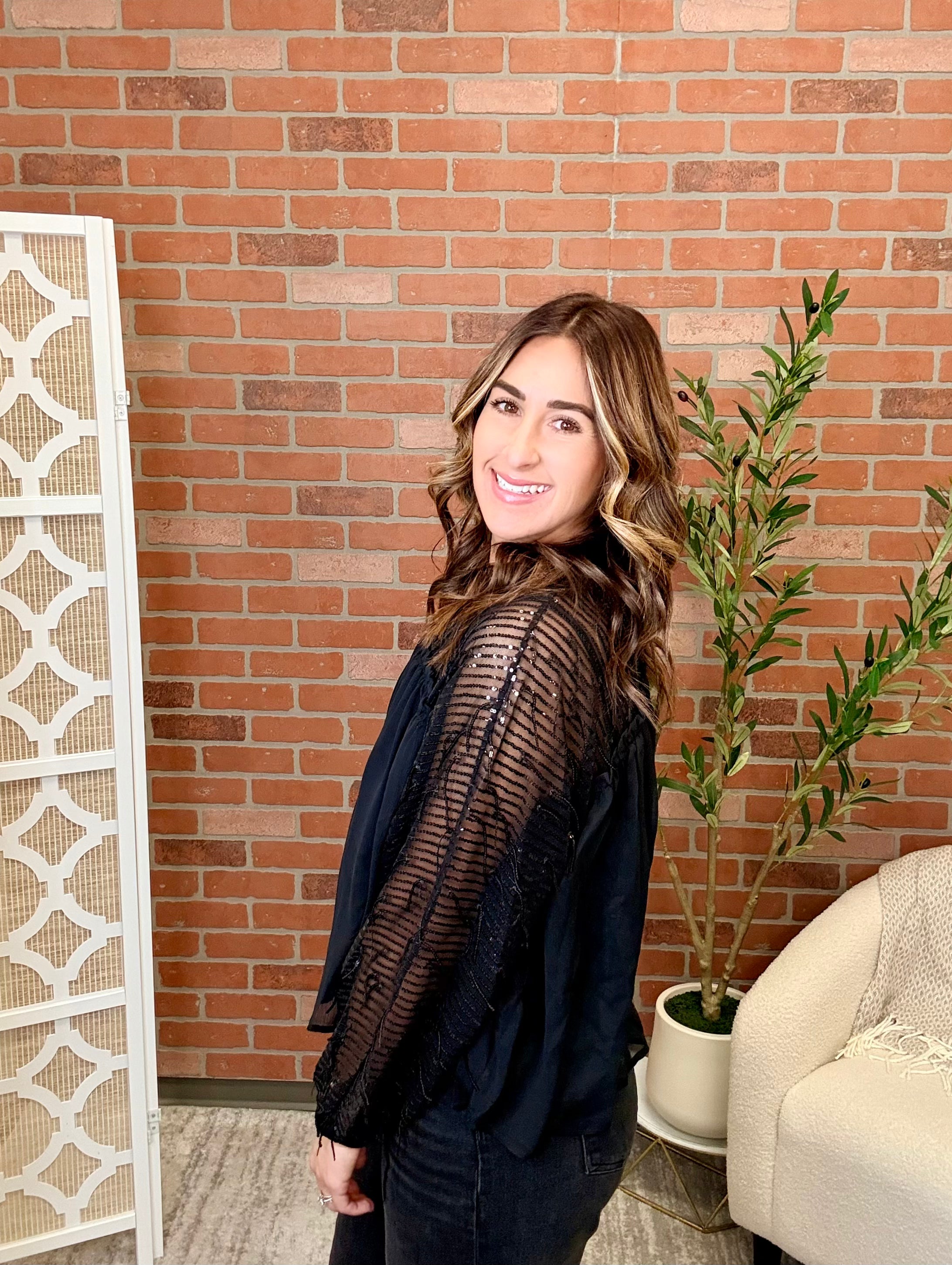 Get ready to sparkle! This sequined yoked blouse brings instant glamour with dazzling sequin details on the yoke. Perfect for making a statement at any occasion, it pairs effortlessly with jeans or dress pants for maximum shine.