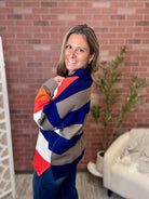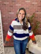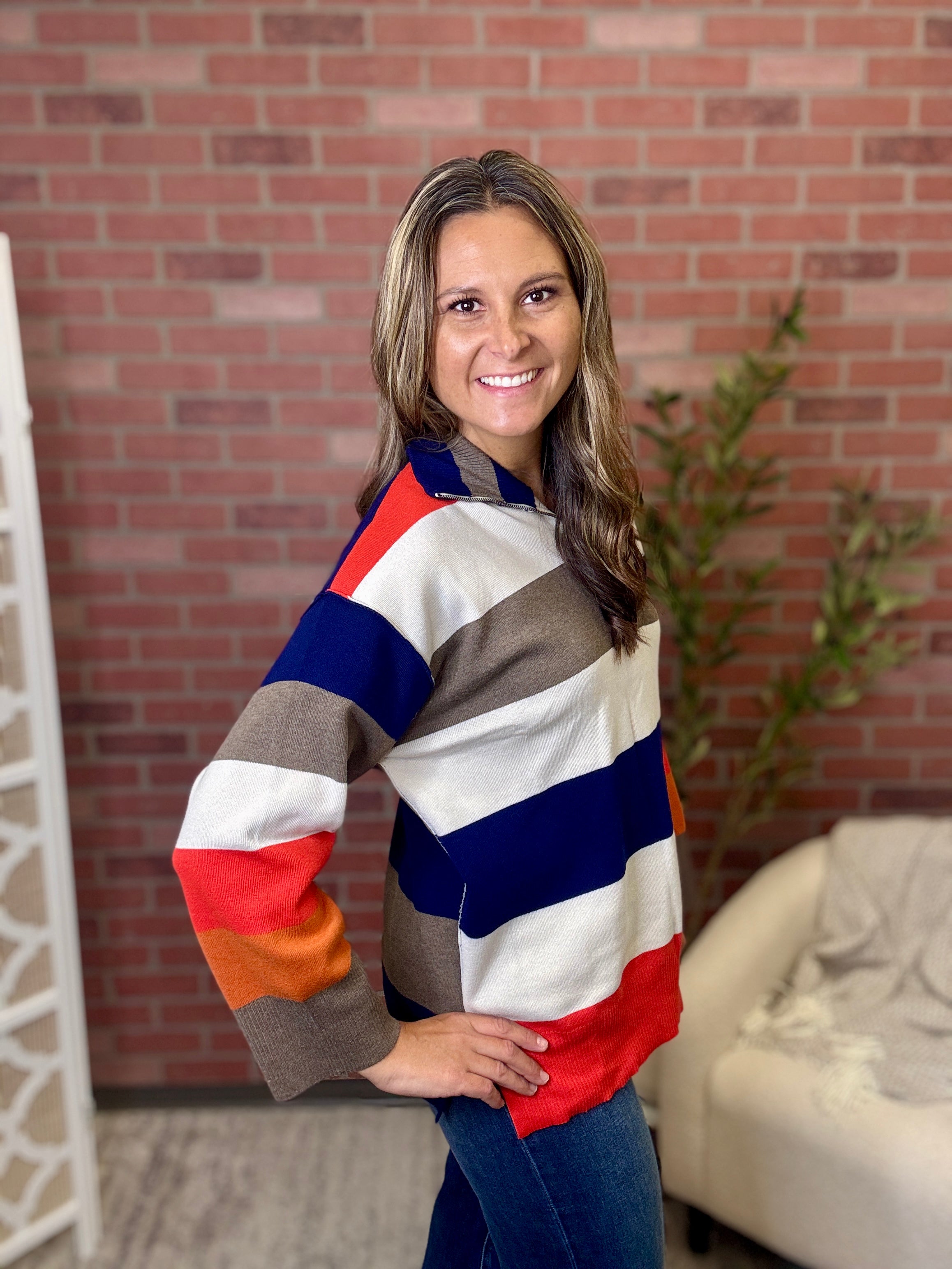 Add a splash of fun to your wardrobe with this Striped Half Zip! Its bold stripes brighten up any outfit while the half-zip design lets you play with your look and temperature. Cozy enough for cool days, it’s perfect for layering or wearing solo when you want to keep things light and lively.